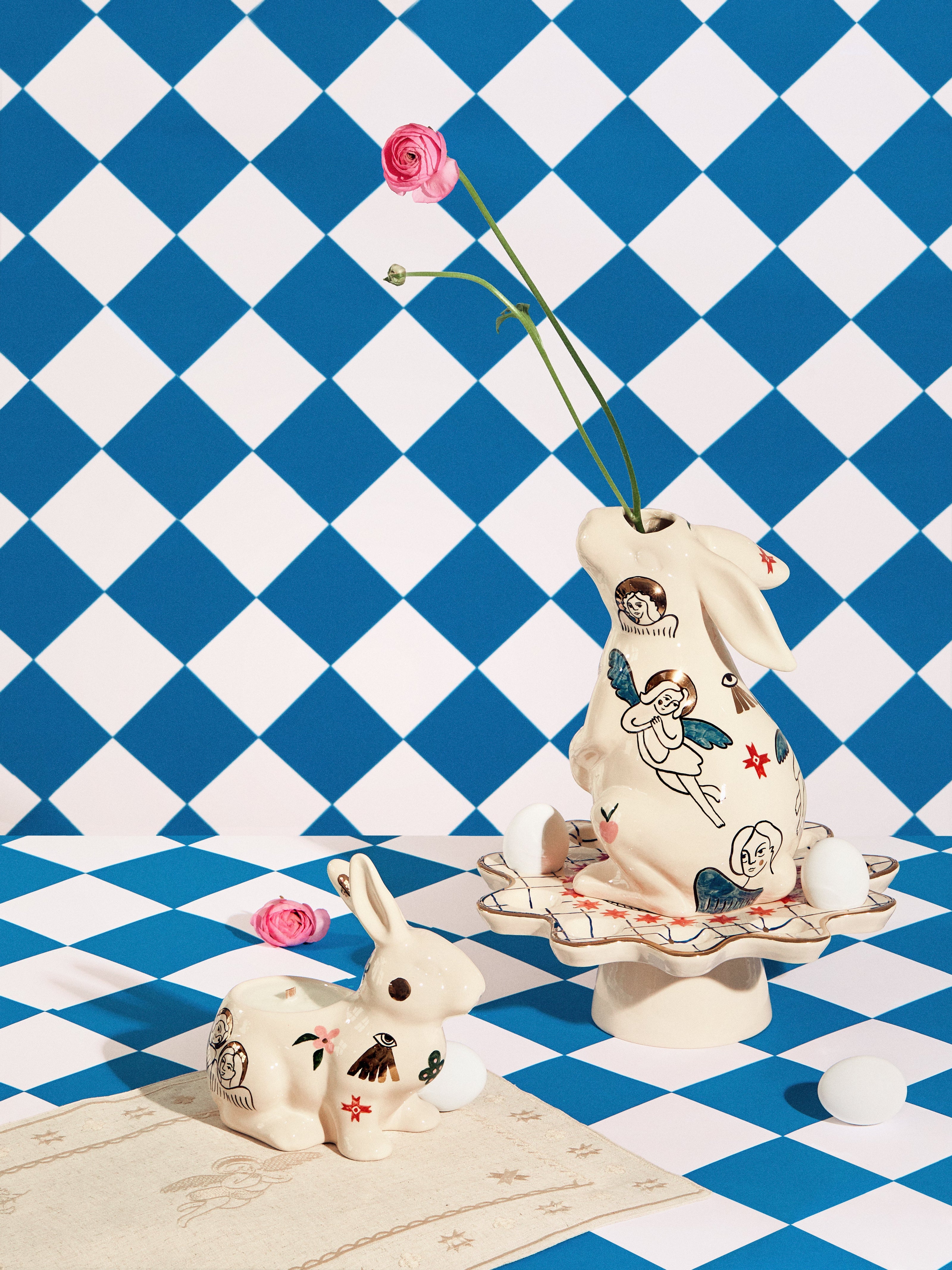 This time, the brand’s artistry is infused with abstractive and minimalistic motifs. The compositions become more airy and non-linear, still, preserving their inherent delicacy. An alternative stylistic perspective comes to life through the paintings on the plates, tea or coffee sets, and other ceramic objects comprising the collection. Lamb-shaped candle holders are reminiscent of the animalistic symbolism of Easter, and egg-shaped plates are dedicated to the symbol of life and rebirth. The color palette celebrates the awakening of nature which comes with spring.