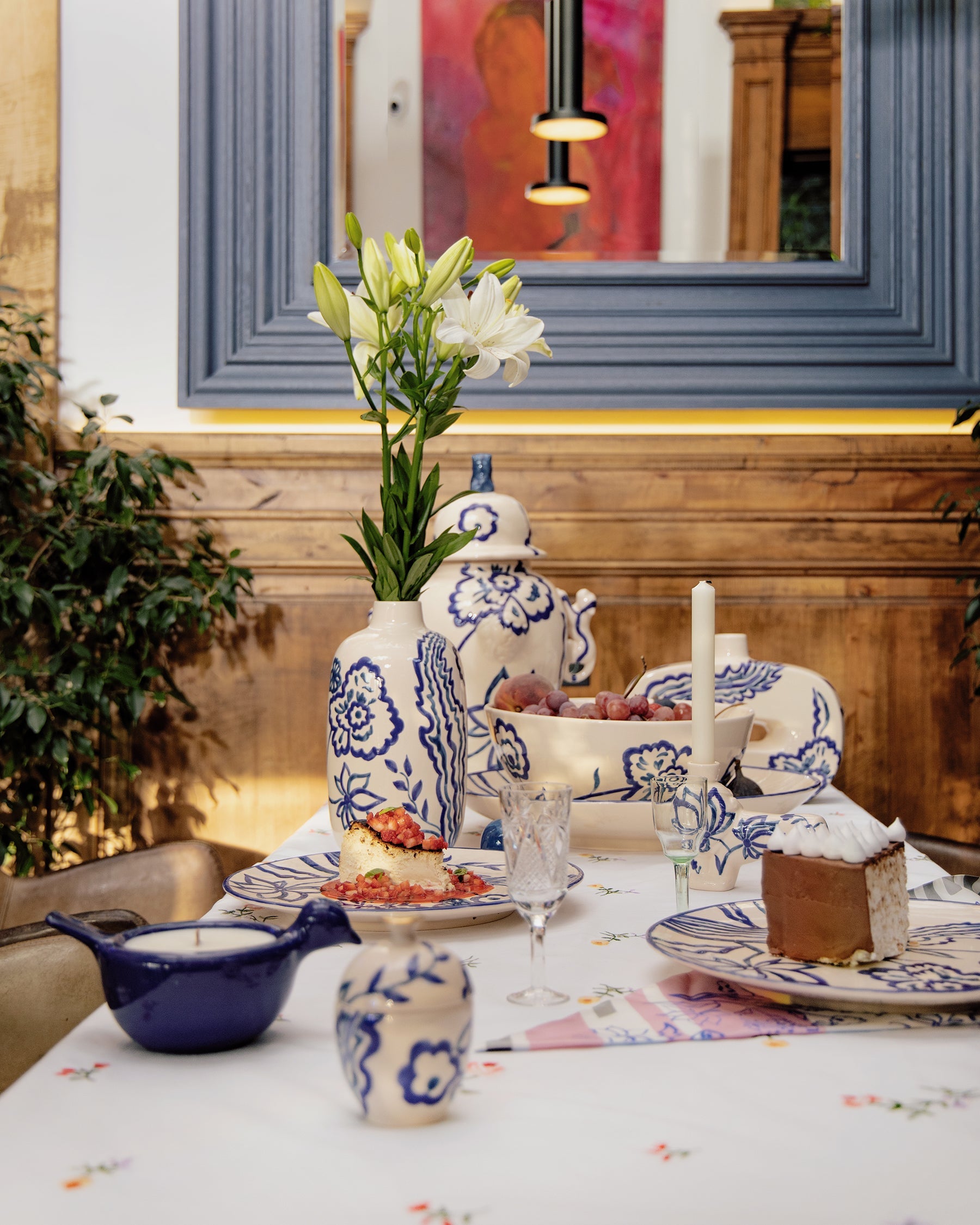 Taking the indigo color and traditional ornaments of Ukrainian carpets as a basis, the brand's designers experimented with shapes, giving them Asian motifs. The capsule contains ceramic products and silk scarves. In support of the collection, GUNIA Project launched a new fragrance of the iconic bird candle, made in blue. Traditionally for the brand, all products are created and painted by hand.