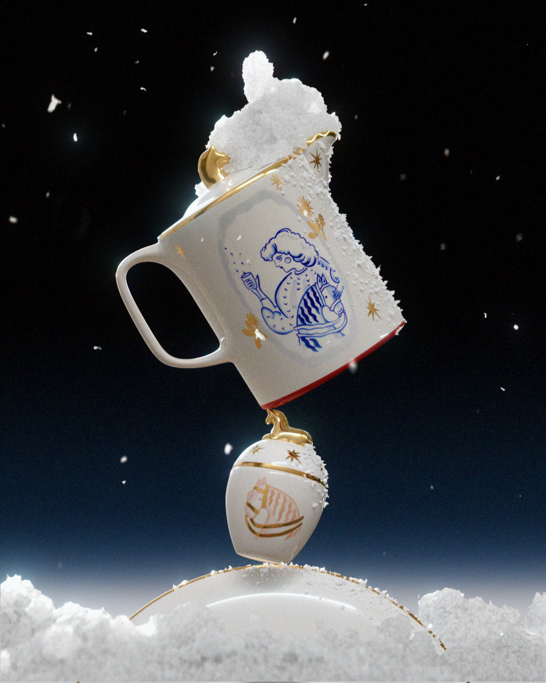 The collection includes a range of hand-crafted ceramics: decorative plates, wine carafes, sugar bowls, teapots, and uniquely shaped cups and saucers. Butter dishes and candles take the form of a traditional toy horse. Each item is hand-molded and painted in a soft palette with bright accents and gold detailing, reflecting a festive spirit. The collection also includes hand-blown glass Christmas ornaments, each individually crafted and painted.