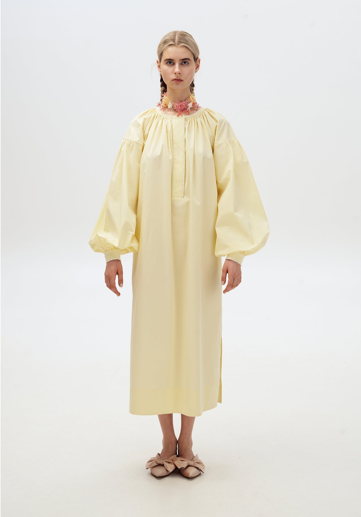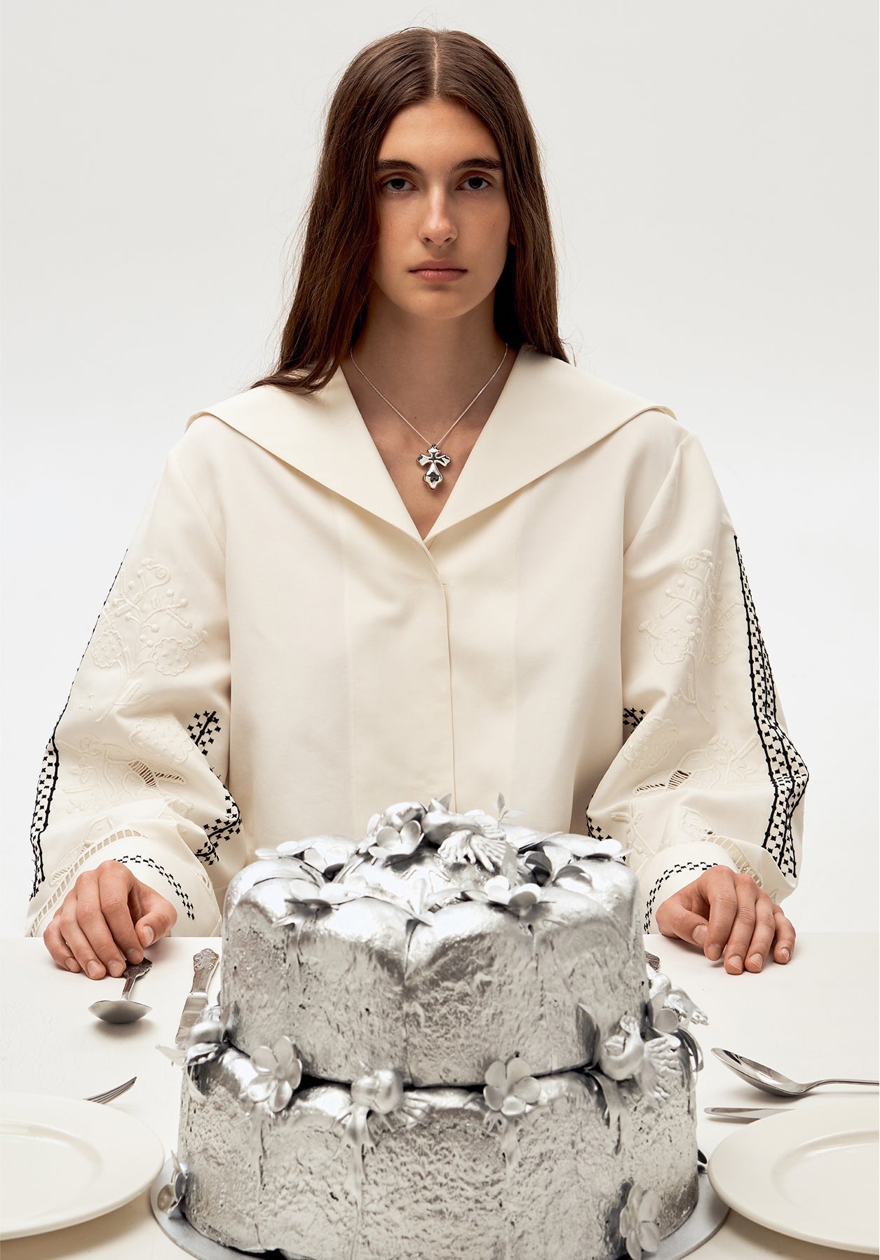 The elements of nature were also popular in the decoration of ceremonial bread, standing for well-being and beauty itself. Thekorovaibread was adorned with braids, cones, flowers, and doves made of dough—such components inform the shape of the GUNIA Project jewelry. The embroidery depicts the social customs, plant, and romantic motifs inspired by naïve rushnyky and painted tiles. The bride’s wax head wreath is reimagined into beaded chokers.