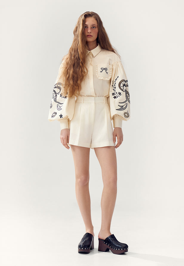 Each piece of clothing begins with the details. Pockets, collars, cuffs, tassels, drapery, ties - individual components are carefully, gradually worked out. Once completed, they are combined into a single whole with the constant involvement of manual labor. Embroidery contains the essence of symbolism, design vision and authentic craftsmanship. Embroidering an "Oriyana" shirt takes 4.5 hours. The process of beading can take up to 13 hours, and the full cycle of creating a product takes up to two weeks.