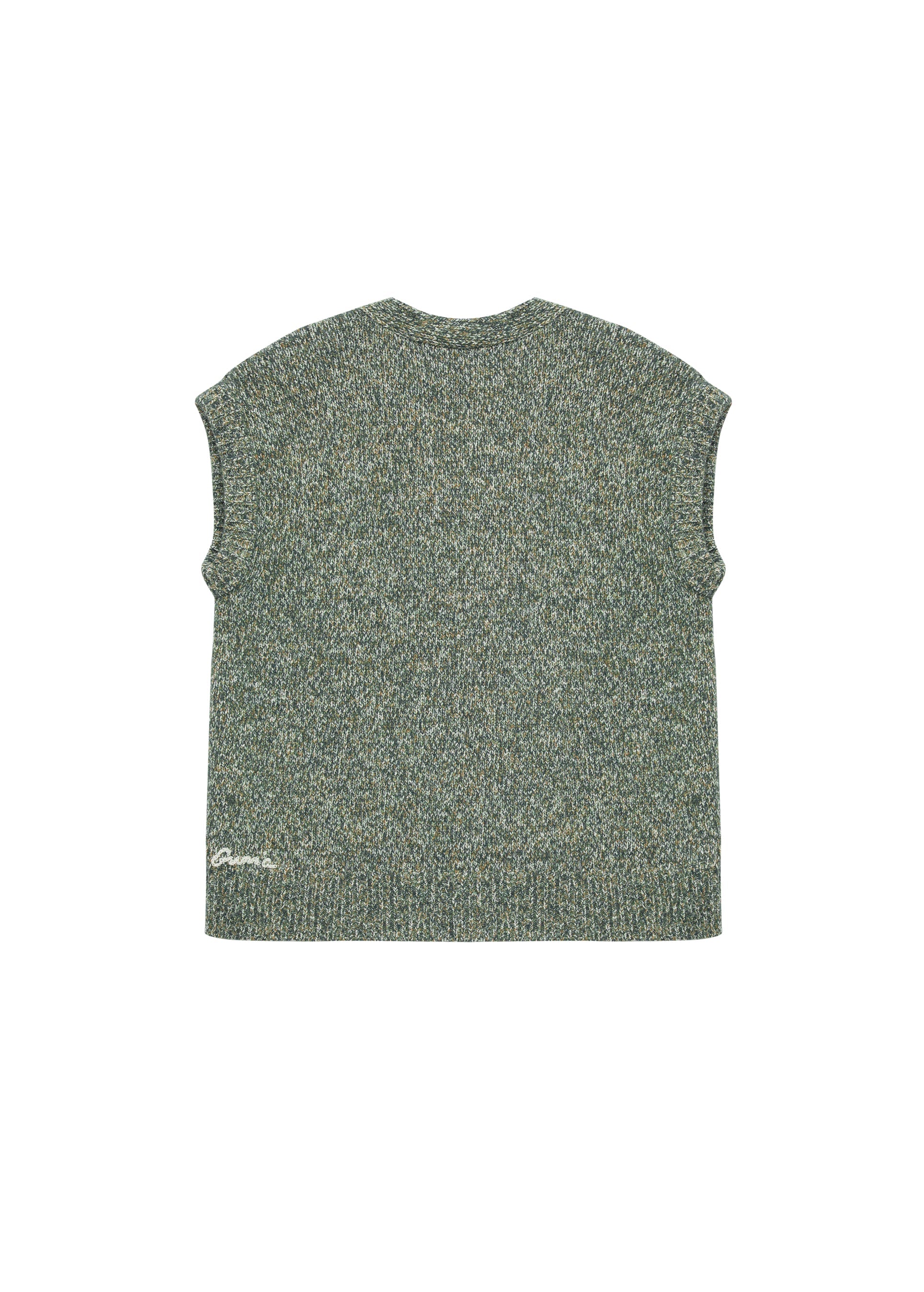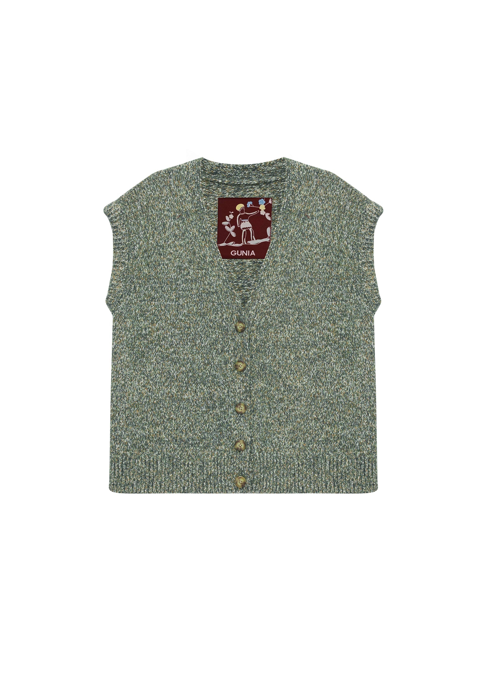 Mélange Button Up Vest. V-neck, button-up front, handcrafted embroidery. A classic vest knitted from soft mélange yarn, embellished with the GUNIA logo, embroidered by hand. Wear it as an extra layer or a main piece. Use it as a basic wardrobe staple or as a gift that blends the warmth of the garment with the traditional craftsmanship of GUNIA’s artisans.