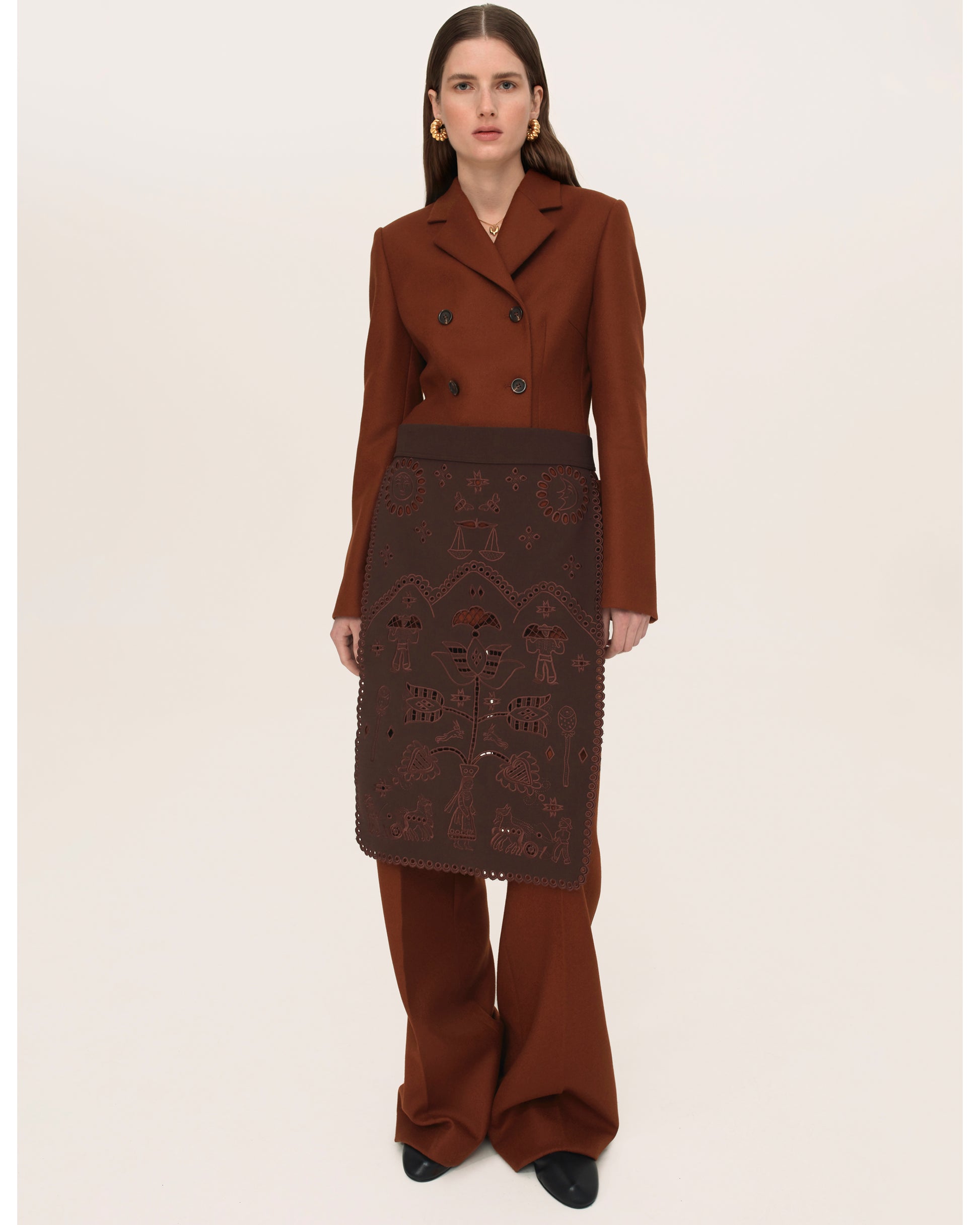 Embroidered Apron in Brown. Historically, aprons were decorated with embroidery and worn over skirts for everyday use and festive occasions. The ornament in the GUNIA’s apron draws from elements of 20th-century Kosiv tiles and a 19th-century monastic embroidered rushnyk from the Kyiv region. The Tree of Life motif, symbolizing fertility, the universe, and family protection, is depicted in the embroidered “vase.”