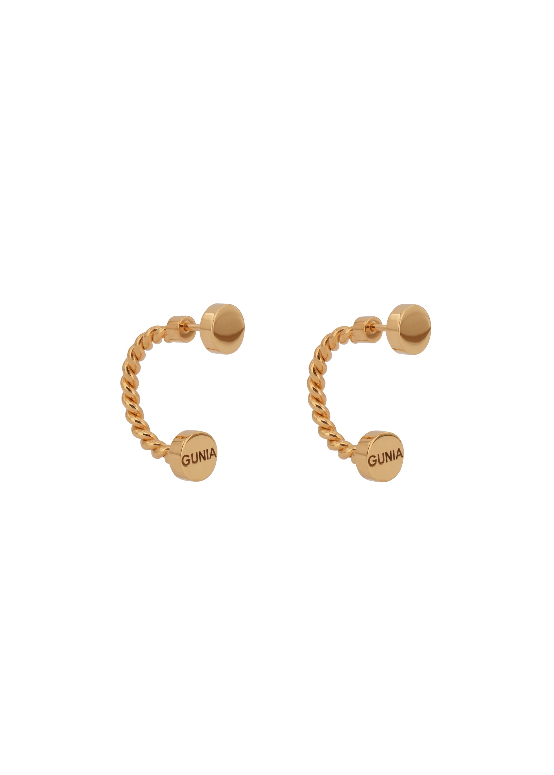 The 'Hryvna' earrings. At first, a historic jewelry piece Hryvna was worn only by men. Soldiers of Kyivan Rus were rewarded with this type of open necklace for their brave deeds. Since hryvna made its way to the women’s wardrobe, it became more precise and elaborate in design. Reimagined from the modern perspective, a twisted hryvna incarnates in the GUNIA Project gold-plated earrings. There are two ways to wear these earrings, as you can place the fastener in front of or behind your ear.