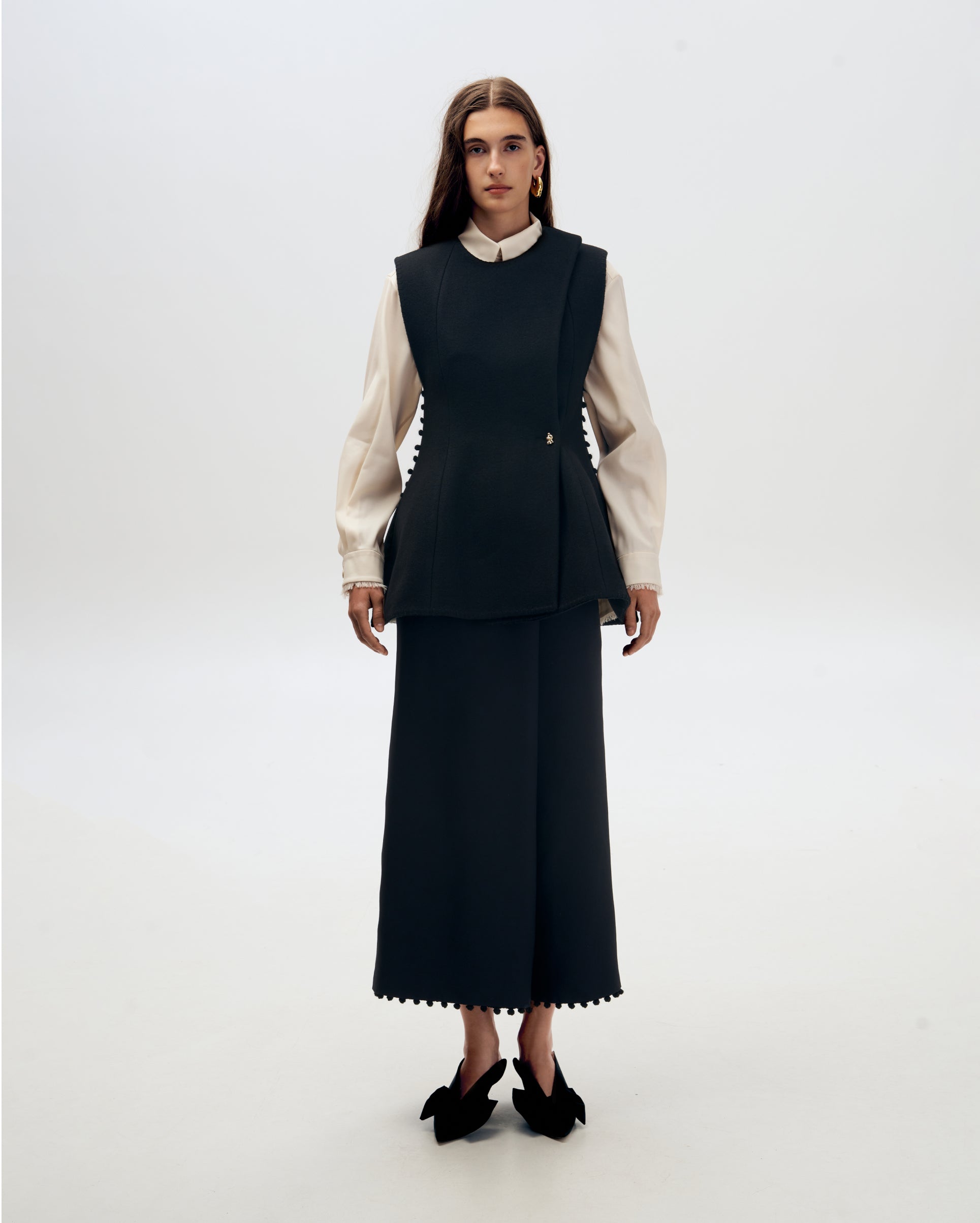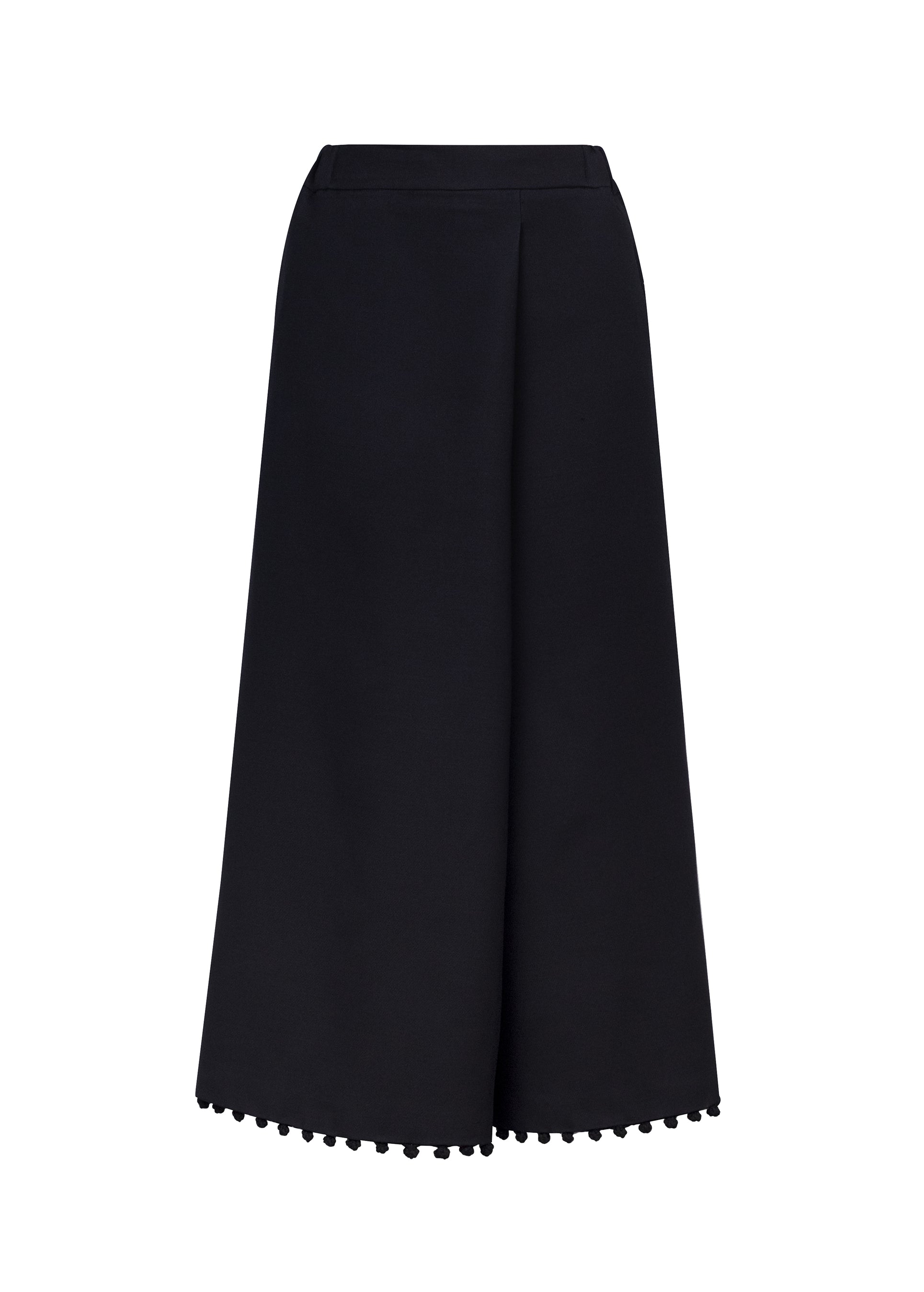 Skirt-Like Trousers. Loose fit is inspired by the silhouette of a traditional Ukrainian wide skirt. At the bottom, the legs feature hand-crafted elements, and the pocket is adorned with cross-stitch embroidery.