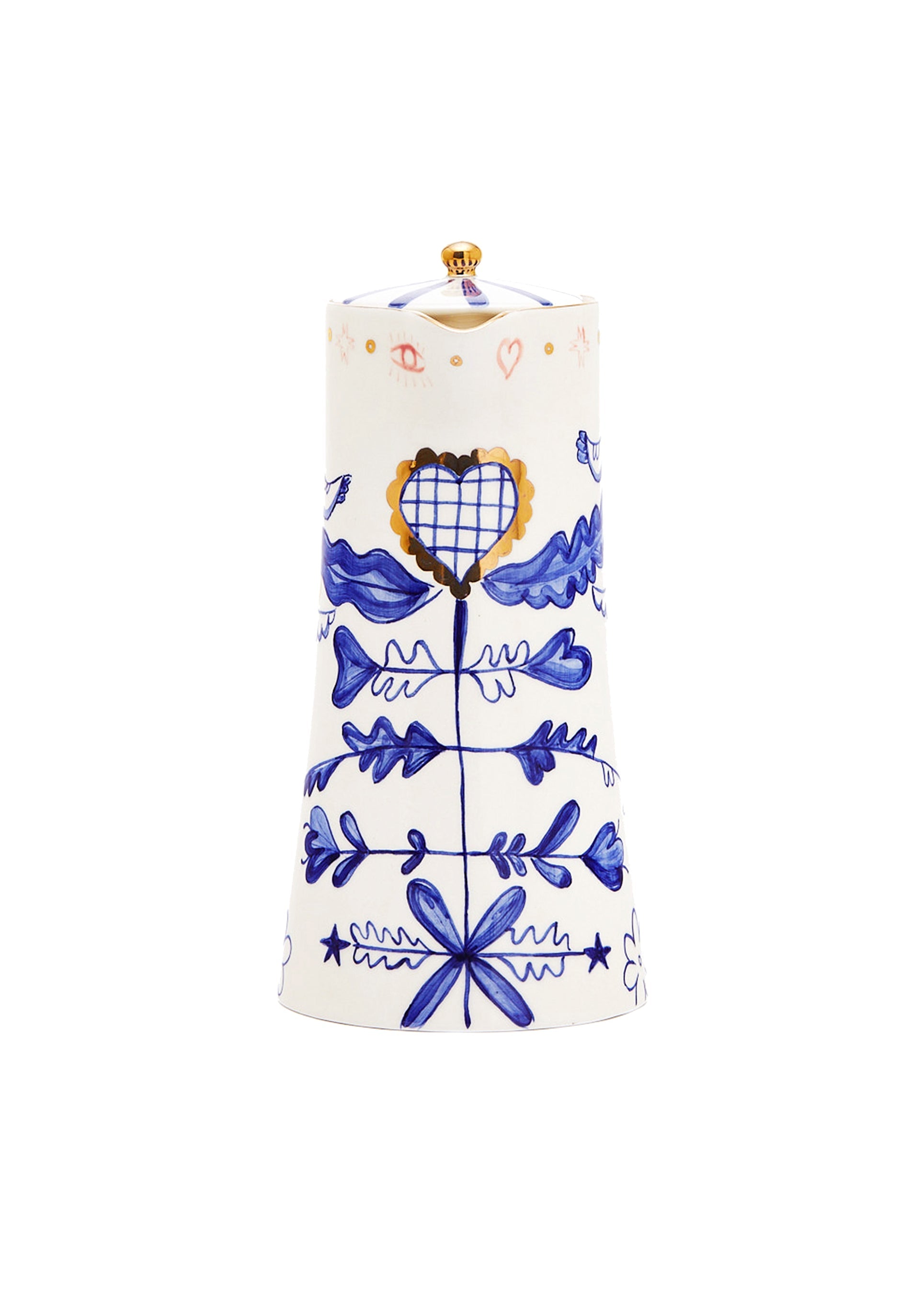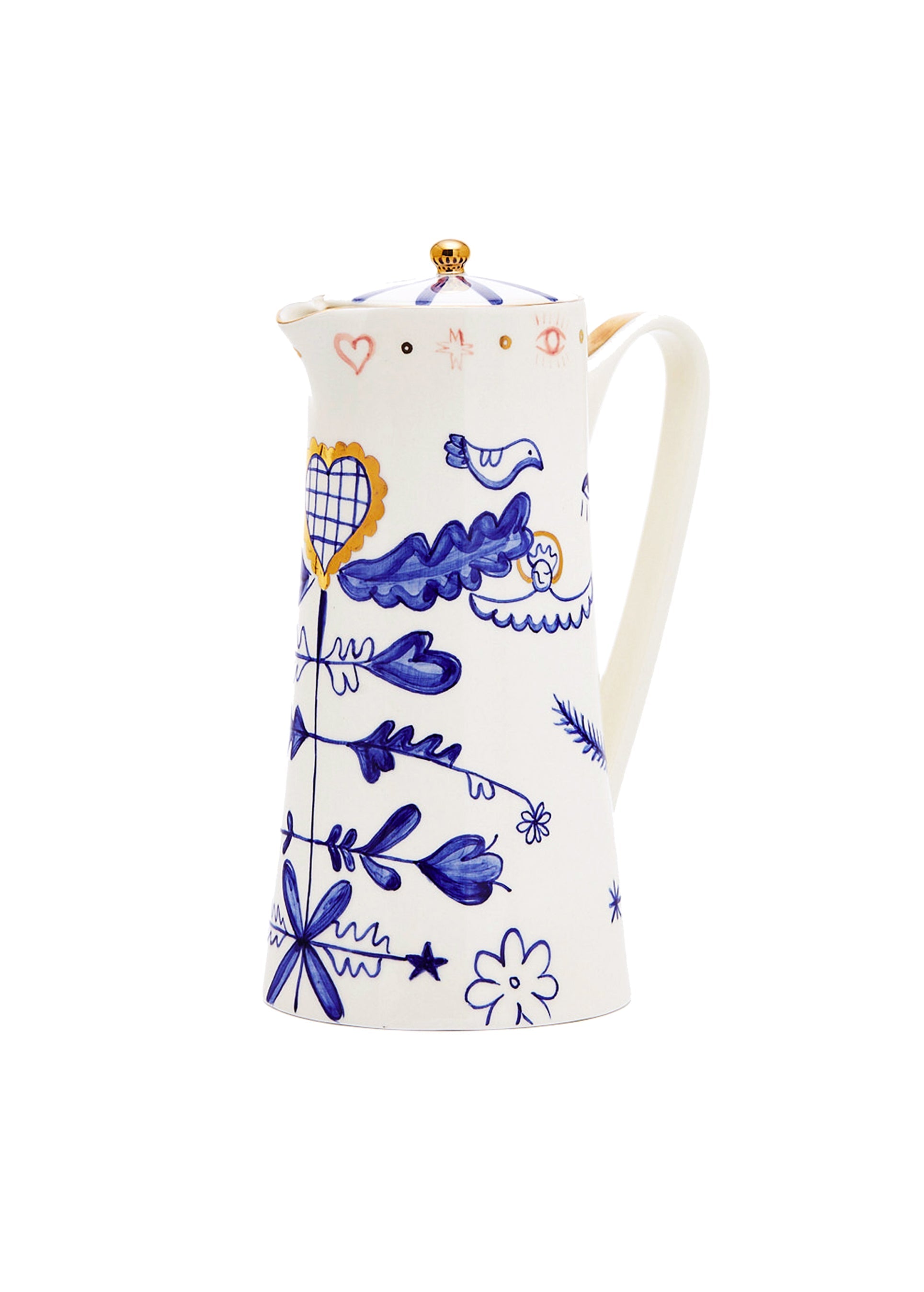 A ceramic pitcher decorated with hand-painted folk-style artwork.