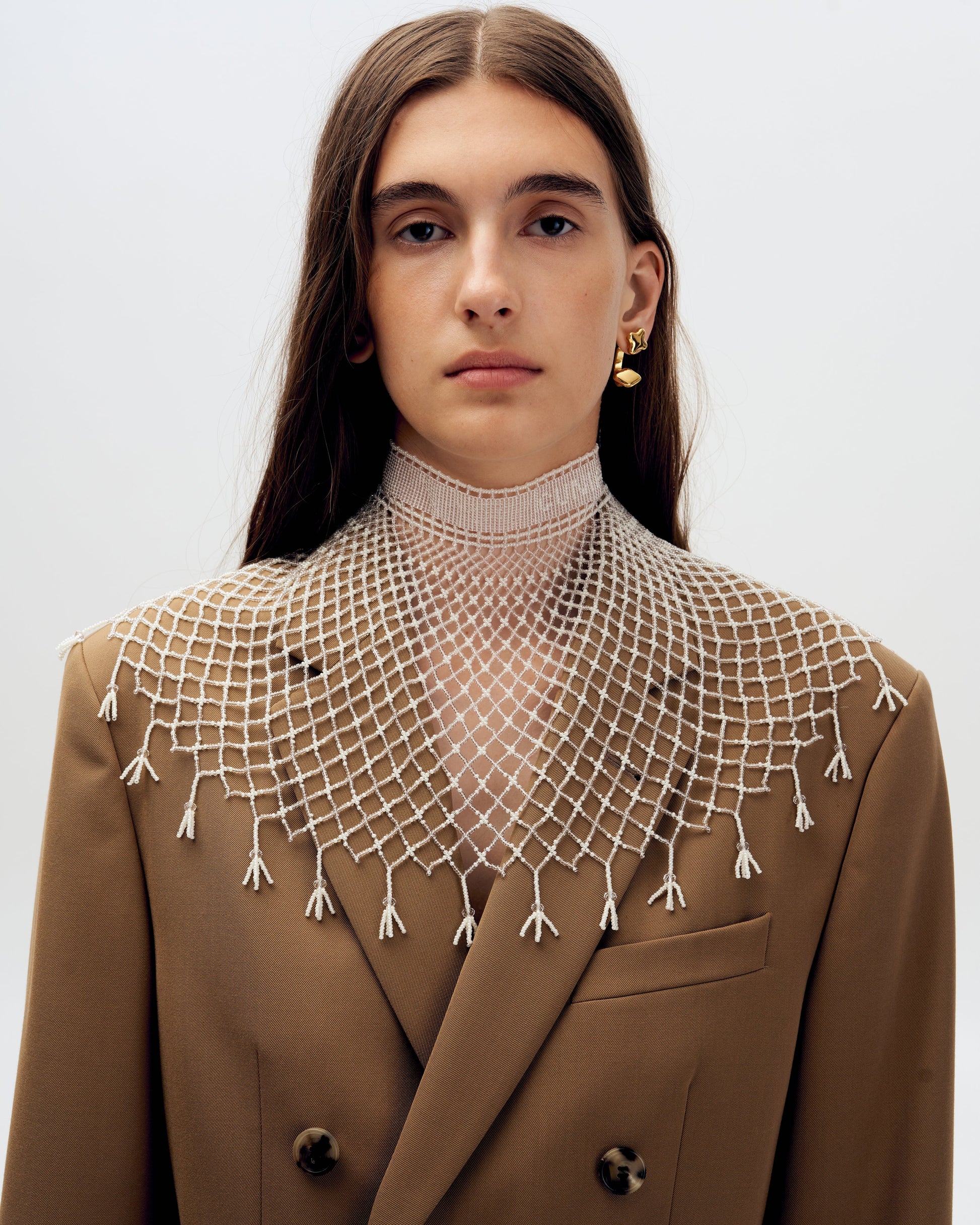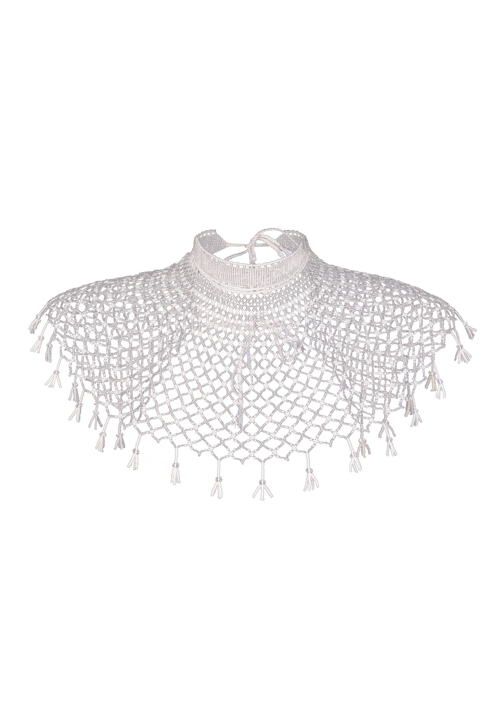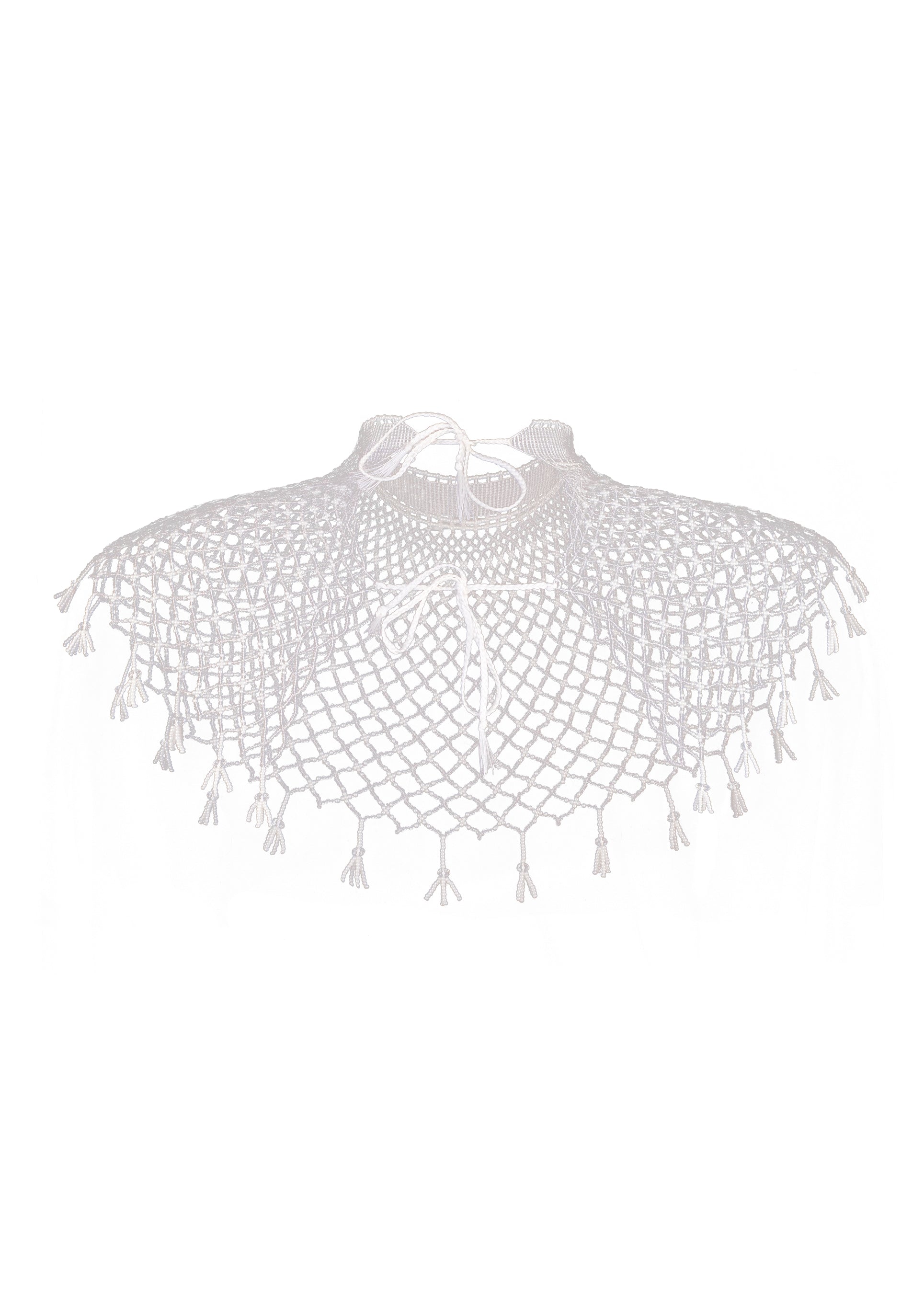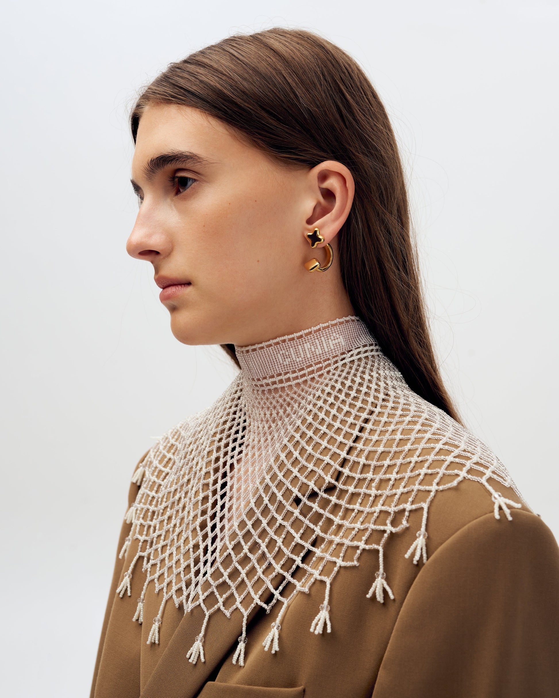 Kryza Panna. The necklace is inspired by traditional Ukrainian jewelry known as kryza — a wide beaded collar with geometrical ornaments. GUNIA Project’s kryza is composed of a logo-embellished choker and gradient rhombs, adorned with tassels. Can be worn on the head or waist. It takes up to 35 hours to create a single kryza.