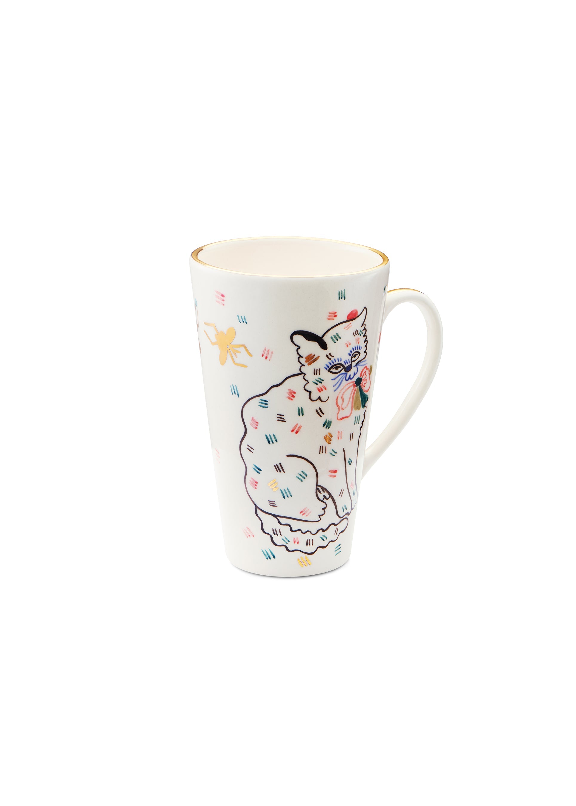 Ceramic mug with a kitten motif. The hand painting is inspired by an embroidered rushnyk from Hubivka, Kirovohrad Oblast, the second half of the 20th c., from the Ivan Honchar Museum collection.