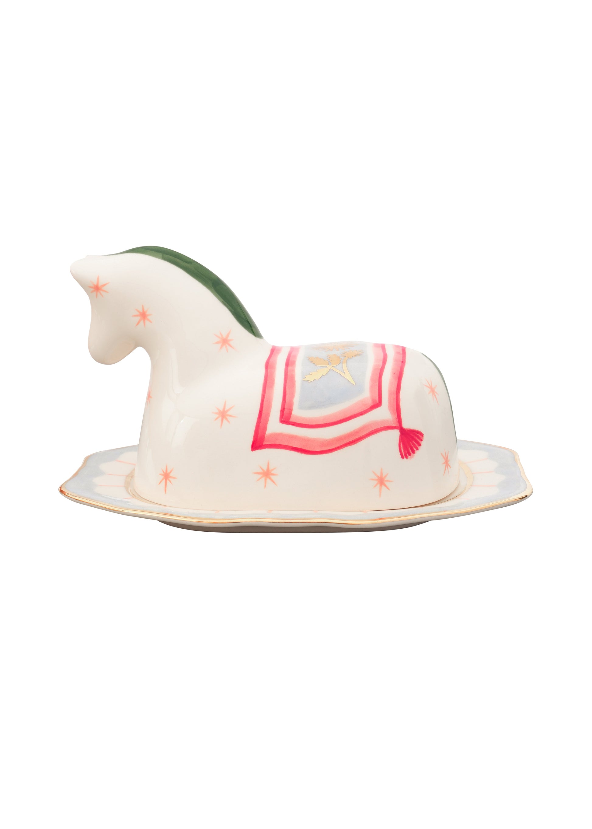Konyk Butter Dish. The shape of the object is inspired by an authentic wooden toy horse. The painted design echoes the motifs from naïve embroidered rushnyky. Each butter dish is handcrafted, ensuring the uniqueness of the item, support for artisans, and the preservation of tradition. This symbolic piece is meant to become a meaningful and touching gift, a cherished family keepsake, or simply a beloved element of coziness.
