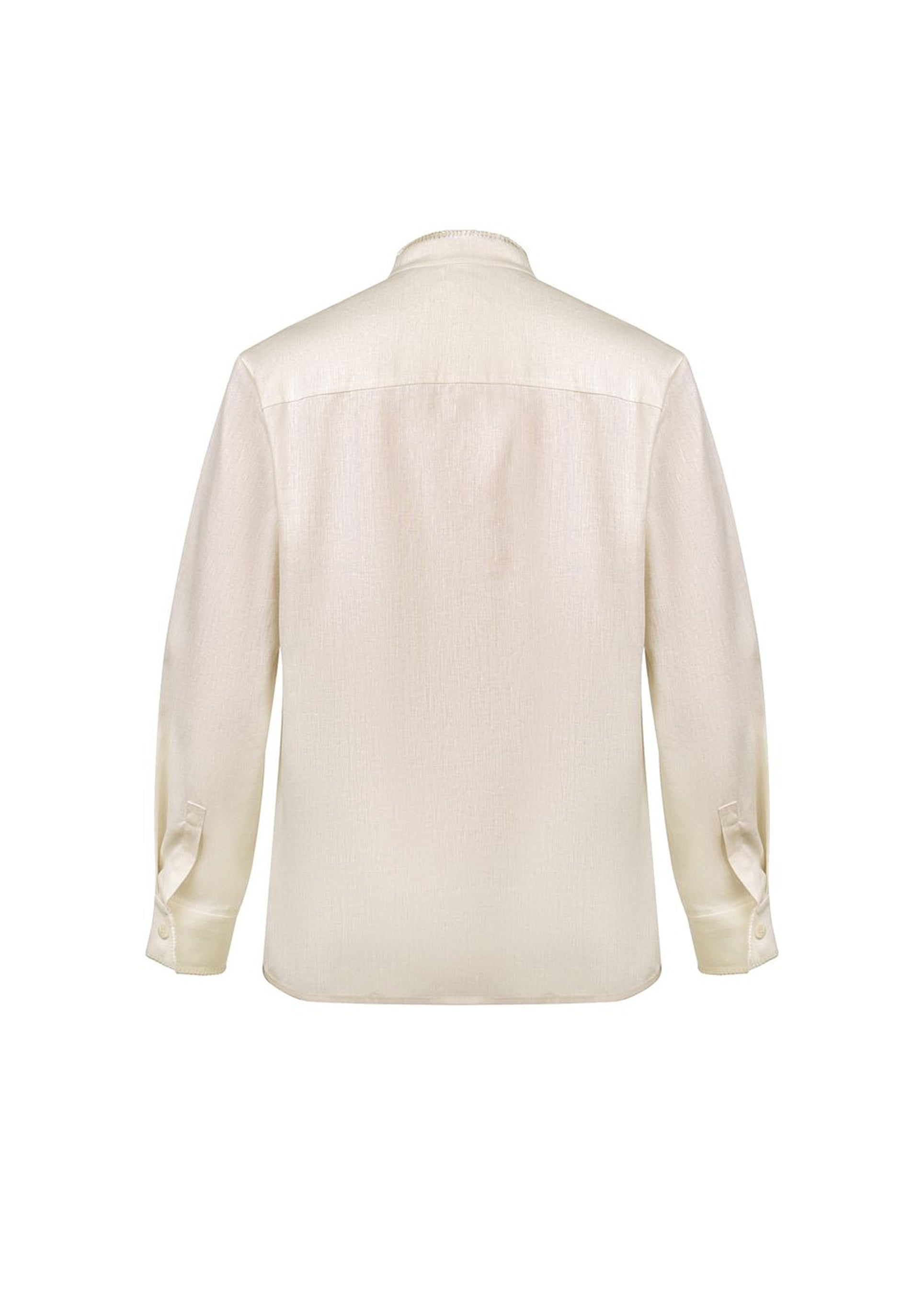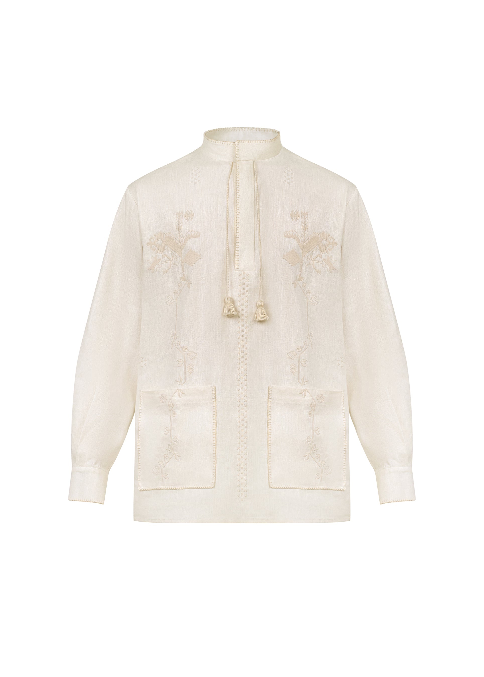 OSYP Embroidered Shirt. The silhouette is inspired by the 19-20-century male shirt from the Khmelnytskyi region, from the Vidkryta Skrynia project archives. The ornament is developed on the basis of the naive embroidered rushnyky and traditional carpets. Embellished with hand-crafted tassels, hand-finished with decorative stitching. It takes up to three hours to finish a single shirt by hand.