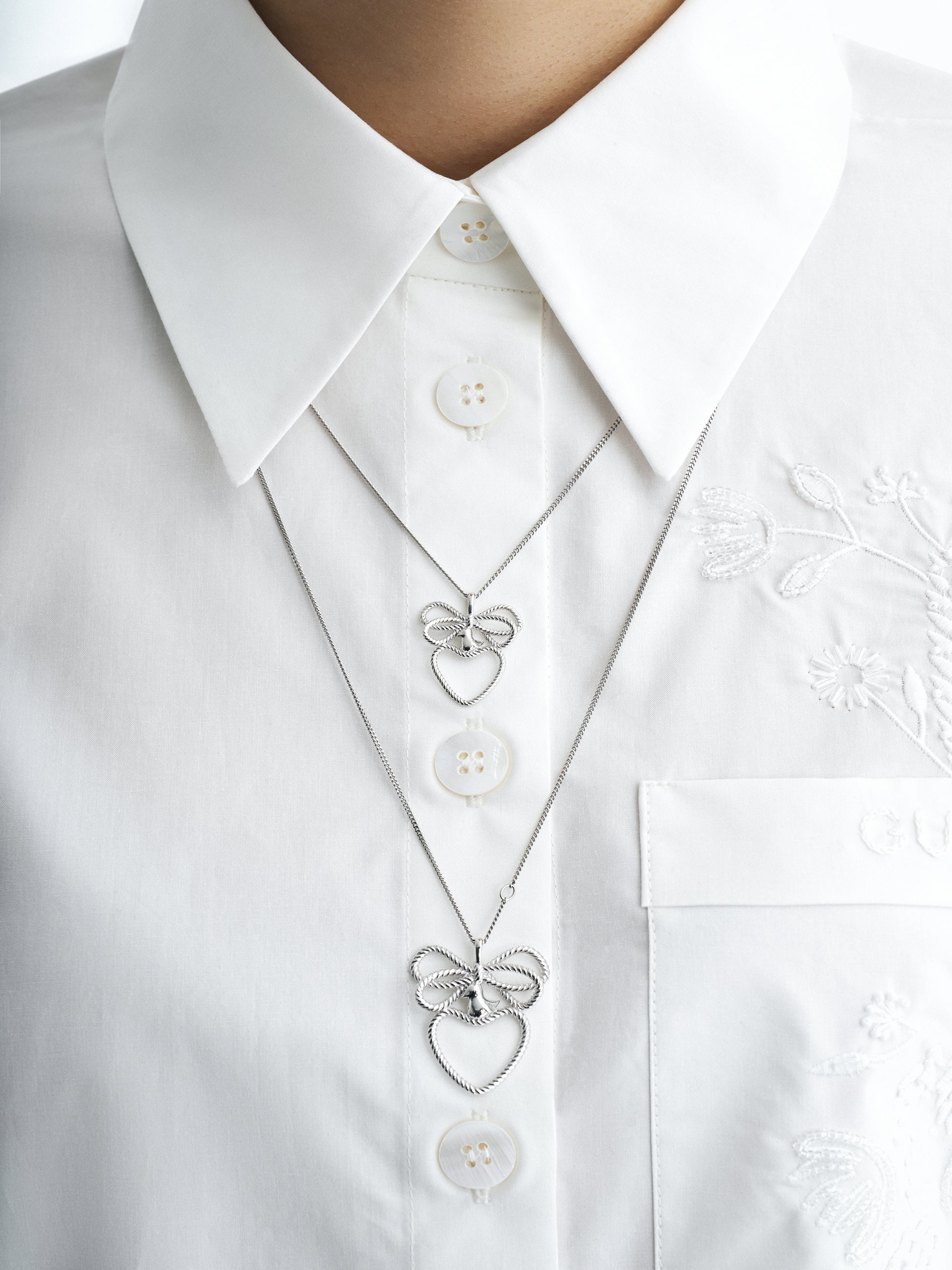 Yahnusok Pendant. The rhodium-plated pendant’s design is inspired by historic dukach jewelry, with its twisted metal technique based on a 20th-century example from the Podillia region of Ukraine. Traditionally, such pieces were often decorated with bows, and a heart-shaped dukach had its own name — yahnusok. In GUNIA’s jewelry, these elements are united by a small bird, symbolizing a tender, lively feeling. An object of clear and touching sentiment, this piece makes a delicate accent to an outfit, a warm gift, or even a way to express love that speaks no quieter than words. Handcrafted.