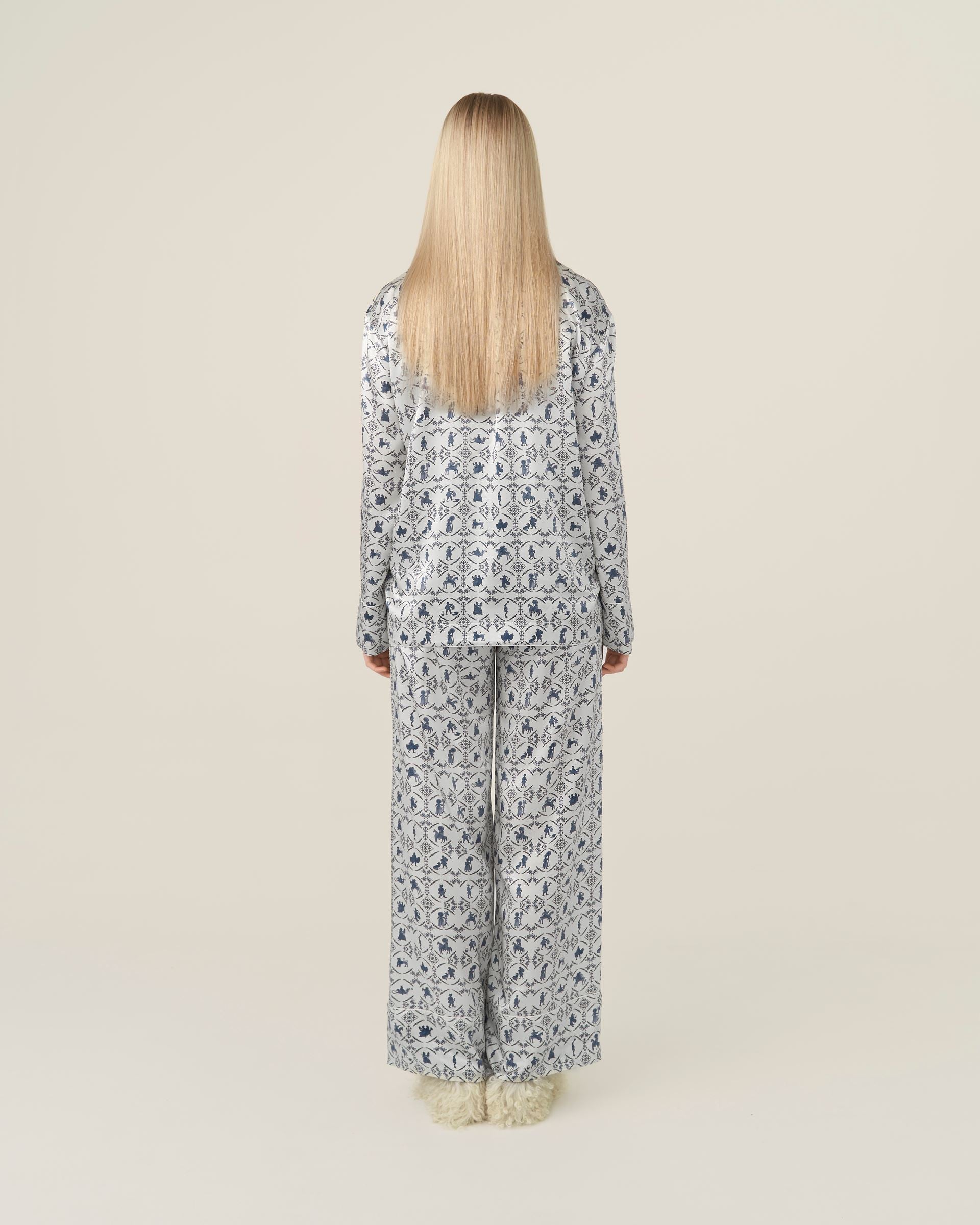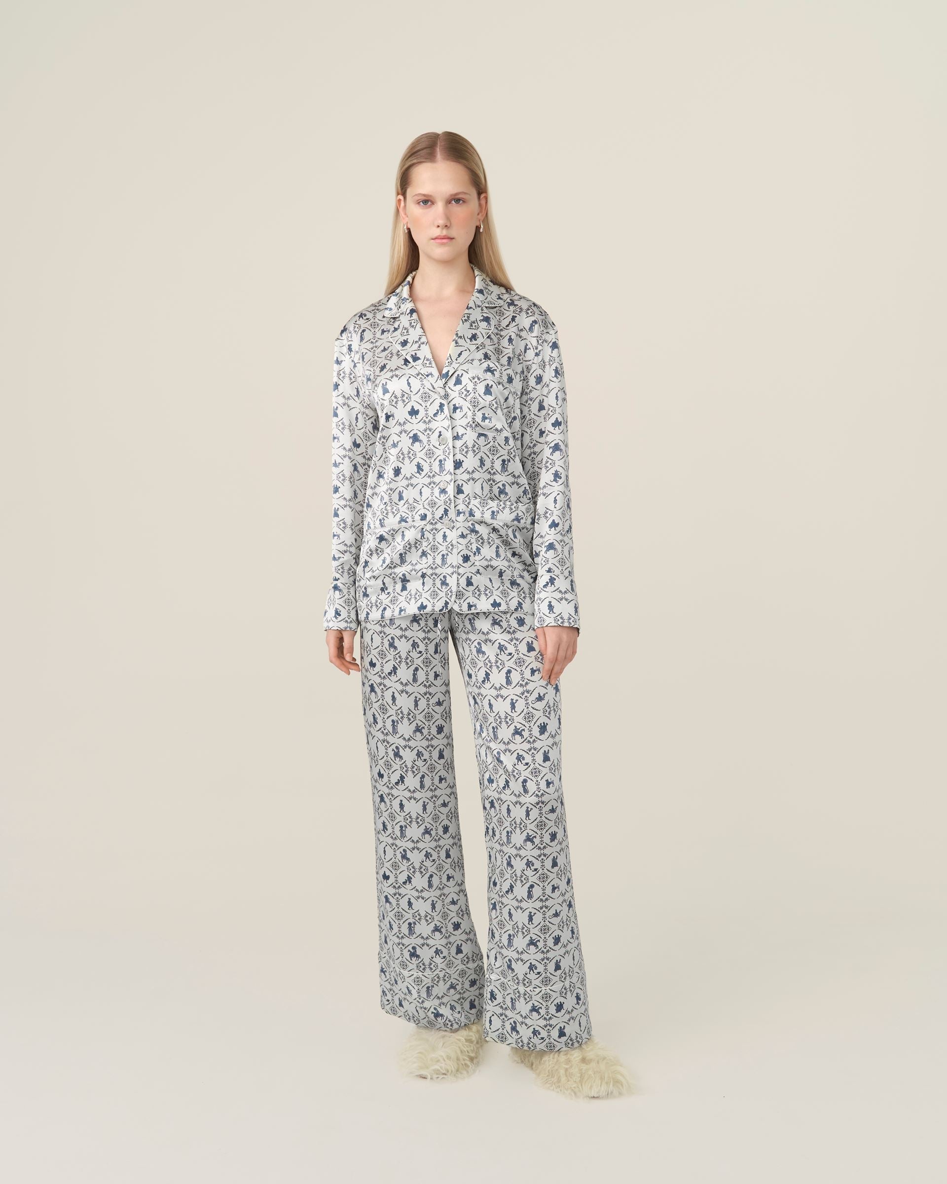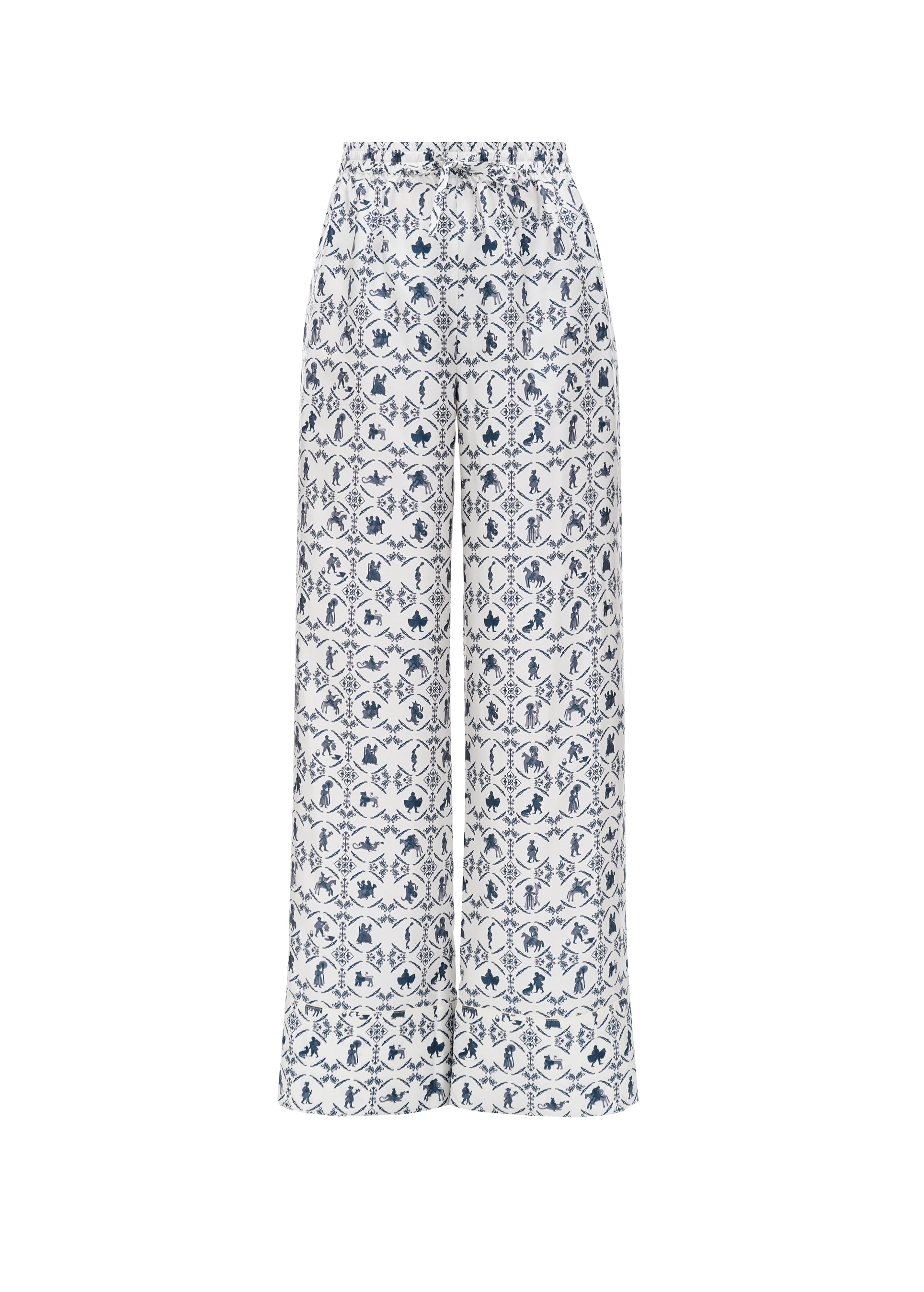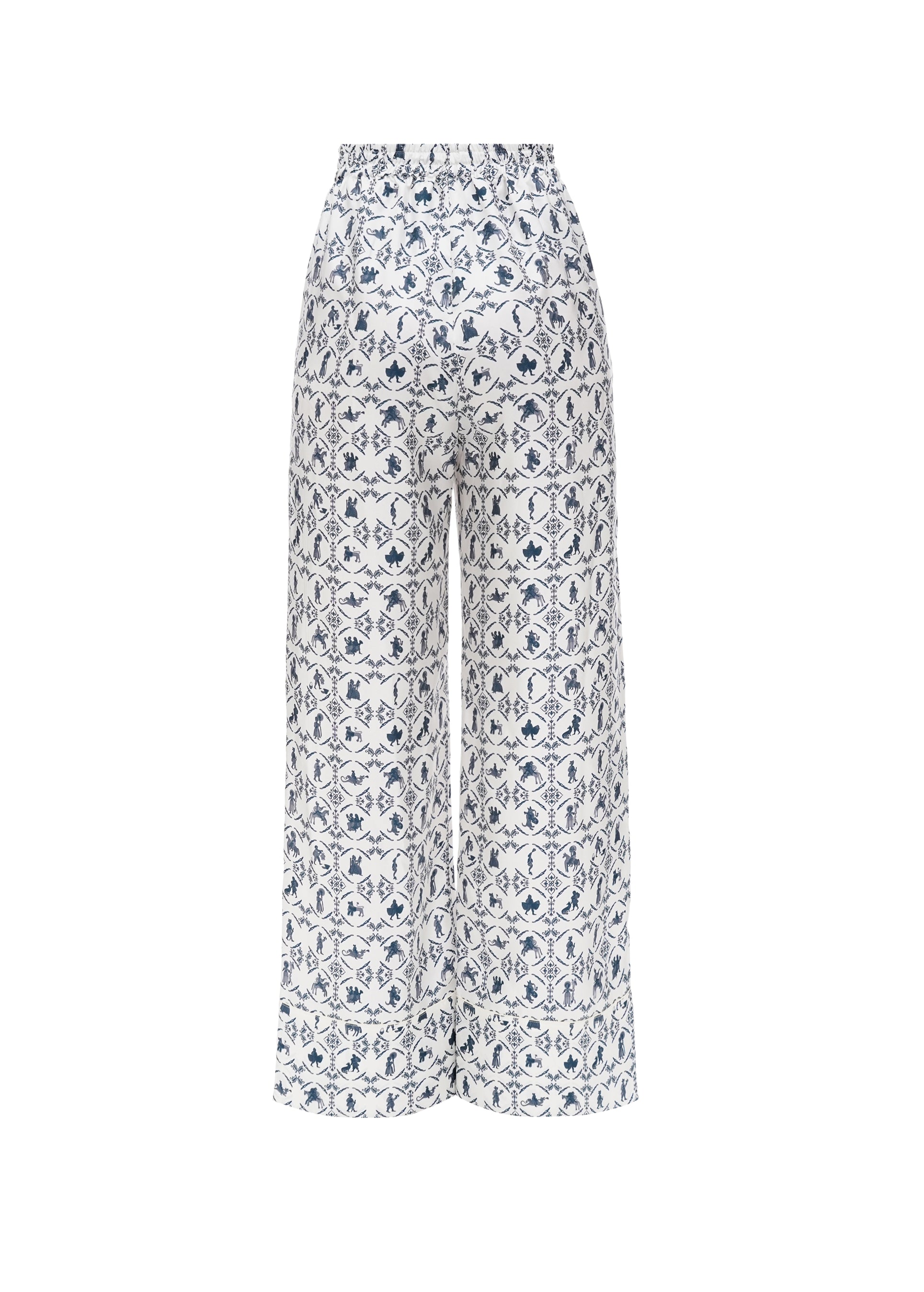Silk pants 'Vechornytsi' in milk. Wide, loose-fit silhouette. The unique pattern is designed based on the ceramic tiles, which adorn the ancient stove in the Olesko Castle. Wear it at home or style it with a matching shirt as a laid-back yet chic street set.