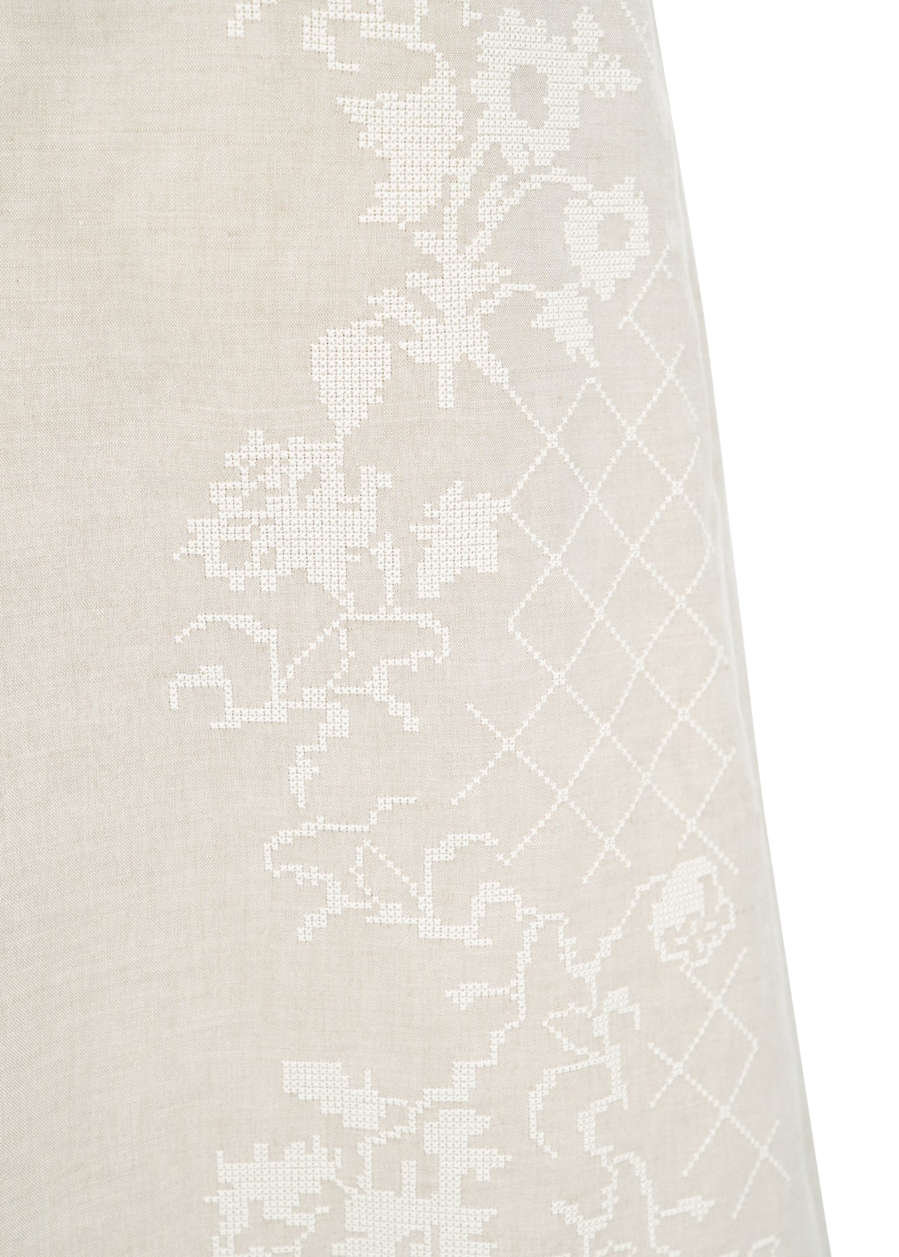 Classic Linen Dress. An element of a woman’s everyday attire. Loose fit, V-shaped neckline, side slits. The dress is embellished with contrasting embroidery that reinterprets the tradition of geometric ornamentation and cross-stitch embroidery. The floral motif is inspired by a woven rug from the first half of the 19th century. Wear it in everyday city life and in the novelty of travel, using it as a versatile wardrobe staple with a Ukrainian spirit.