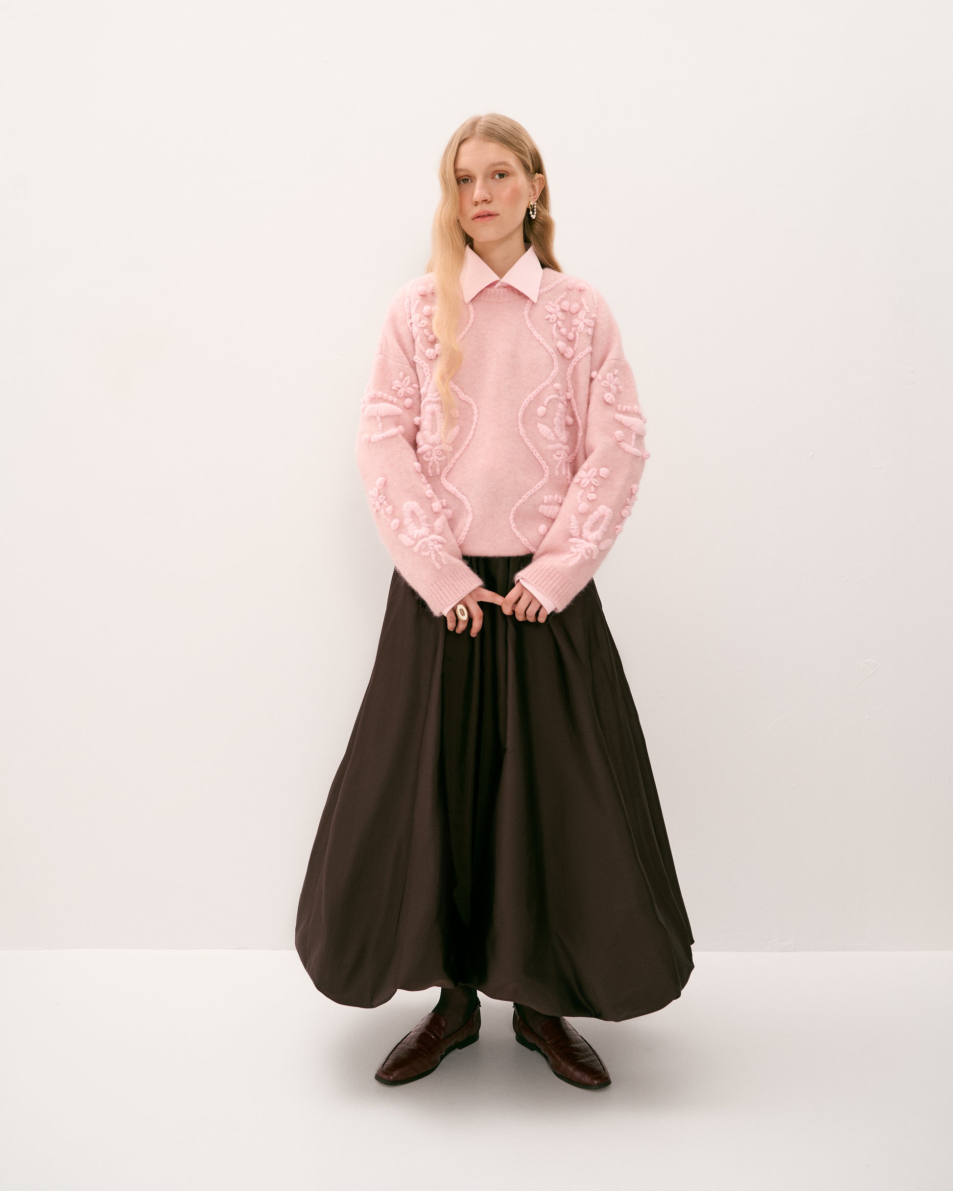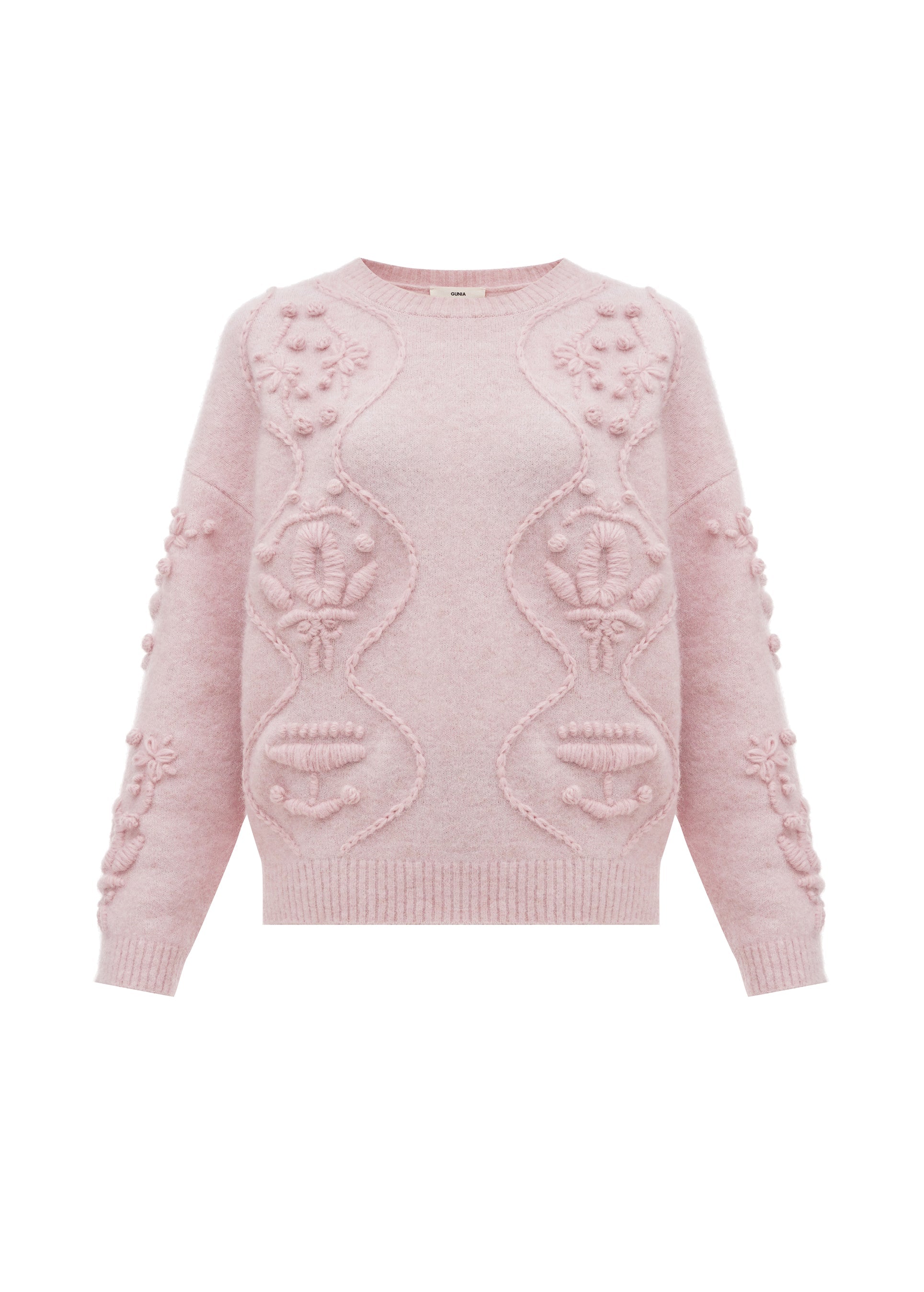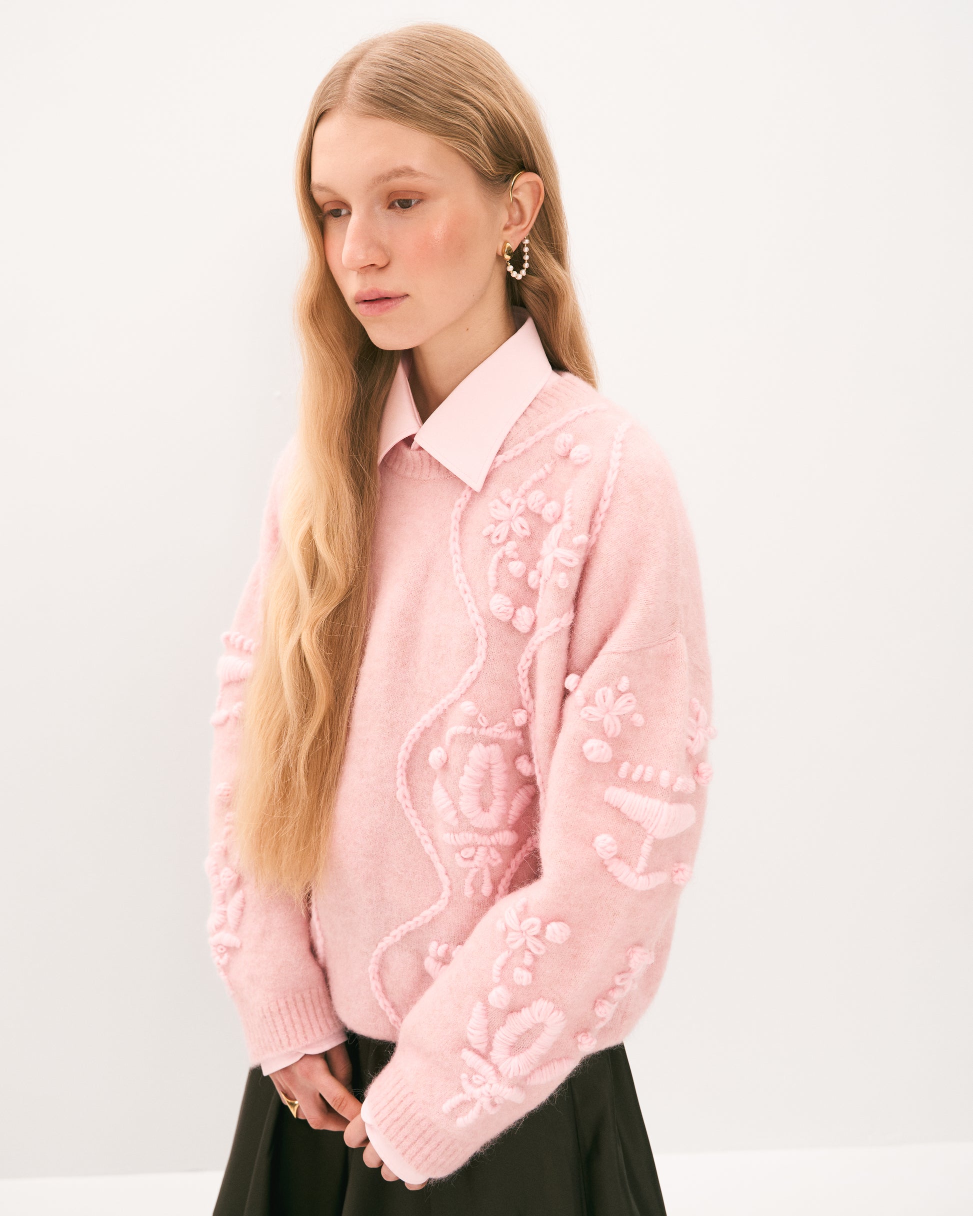 Flowers Sweater. The embroidery design is based on authentic house wall paintings from the Uman and Kamianets-Podilsky regions. It takes up to 18 hours to create a single sweater by hand.
