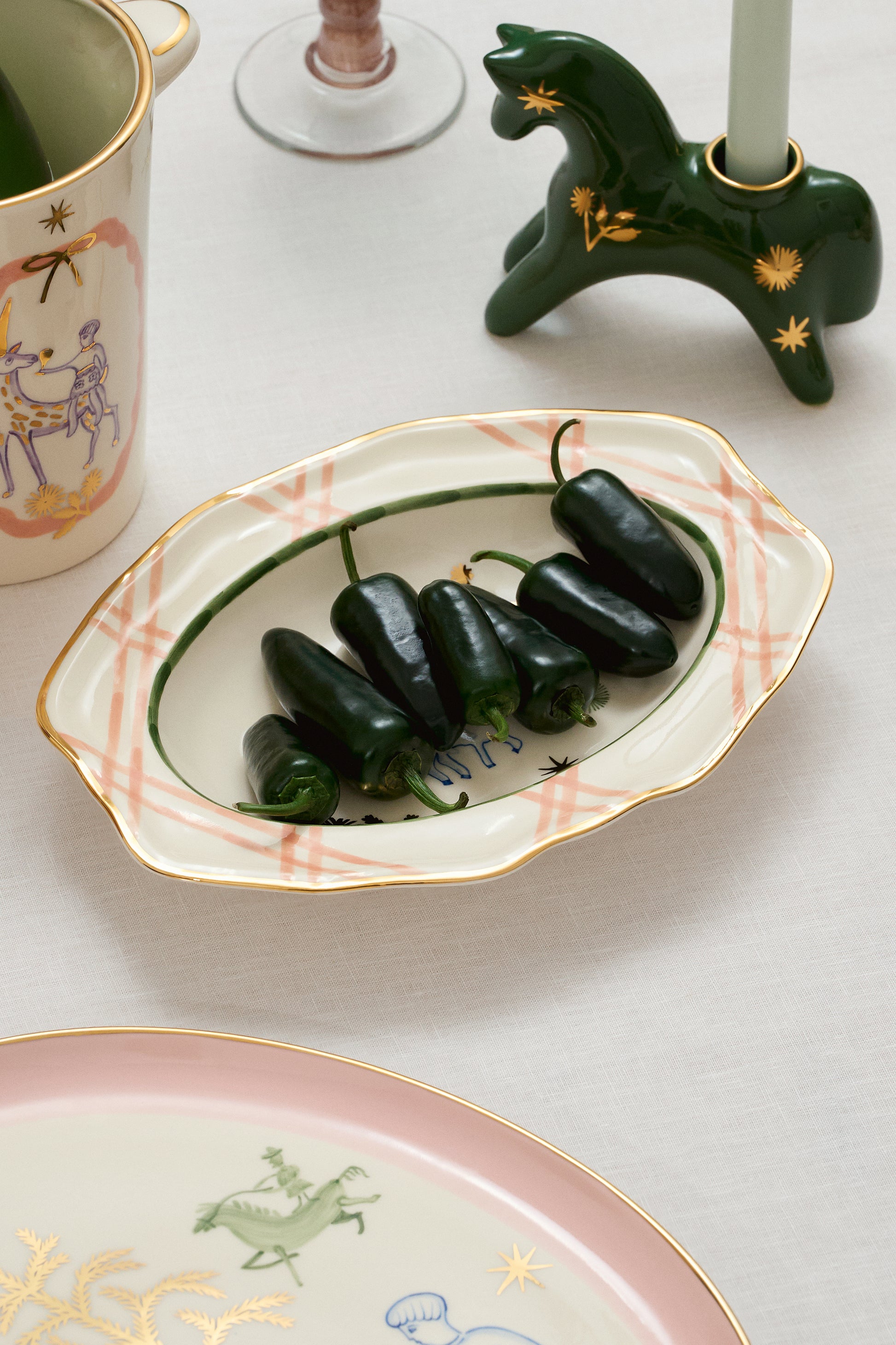 Horseman Plate with Stars. The painted design is inspired by motifs from naïve embroidered rushnyky and a 1900s bowl by Pavlo Samolovych. Each plate is crafted and painted by hand, with glaze and gilding, ensuring the uniqueness of the ceramic item, support for artisans, and the preservation of tradition. This symbolic piece is meant to become a meaningful and touching gift, a cherished family keepsake, or simply a beloved holiday object.