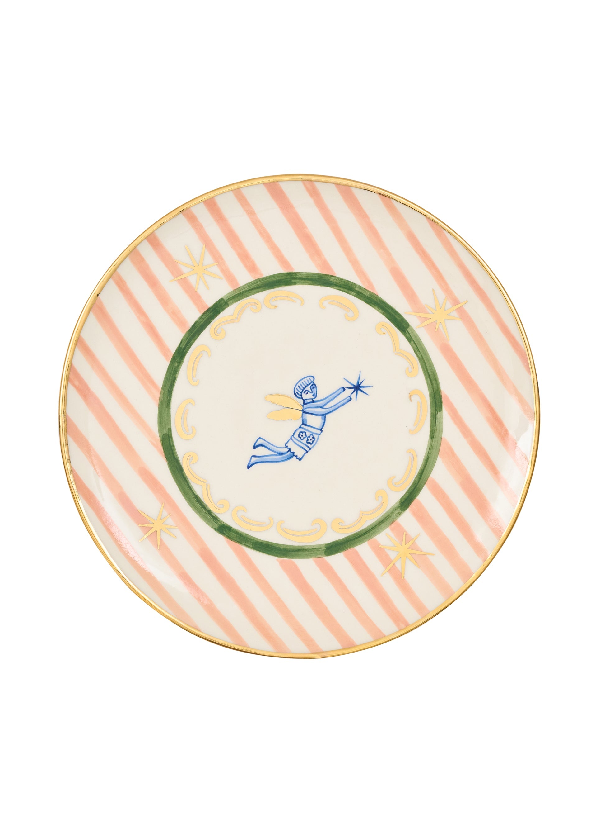 Joy Plate. The painted design is inspired by motifs from a naïve embroidered rushnyk from the Chernihiv region of Ukraine and the optimism of a festive spirit. Each plate is crafted and painted by hand, with glaze and gilding, ensuring the uniqueness of the ceramic item, support for artisans, and the preservation of tradition. This symbolic piece is meant to become a meaningful and touching gift, a cherished family keepsake, or simply a beloved holiday object.
