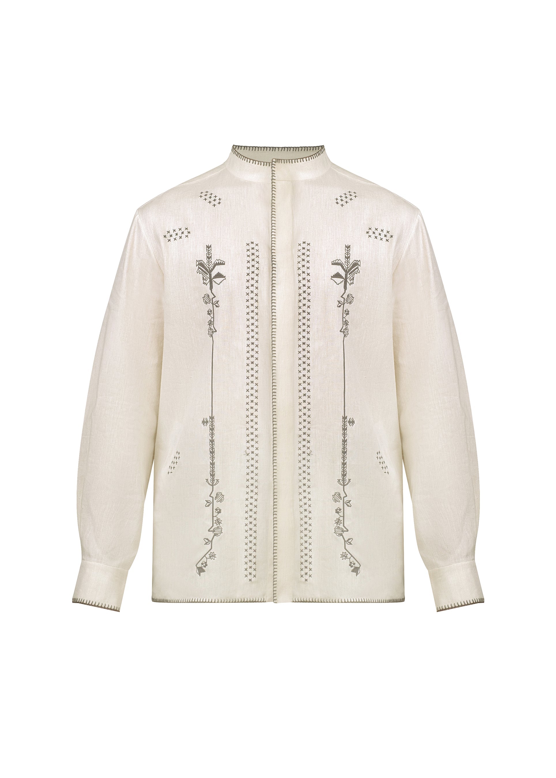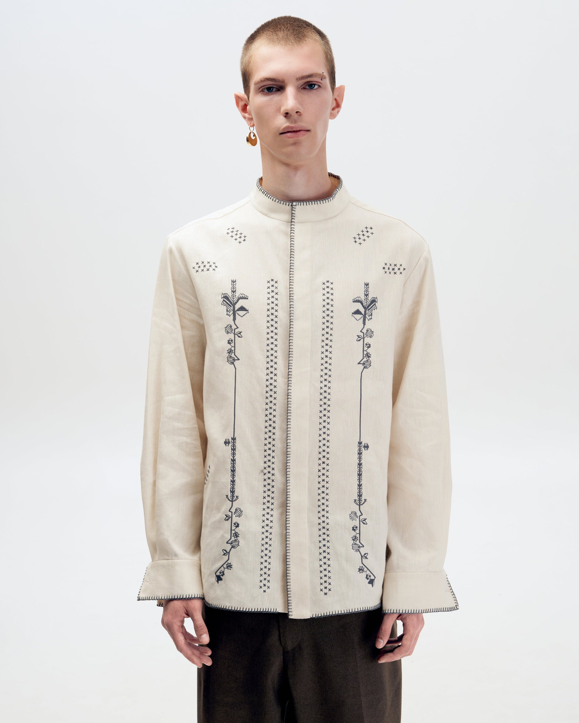 TYMISH Embroidered Shirt. The silhouette is inspired by the 19-20-century male shirt from the Khmelnytskyi region, from the Vidkryta Skrynia project archives. The ornament is developed on the basis of the naive embroidered rushnyky. Hand-finished with decorative stitching. It takes up to three hours to finish a single shirt by hand.