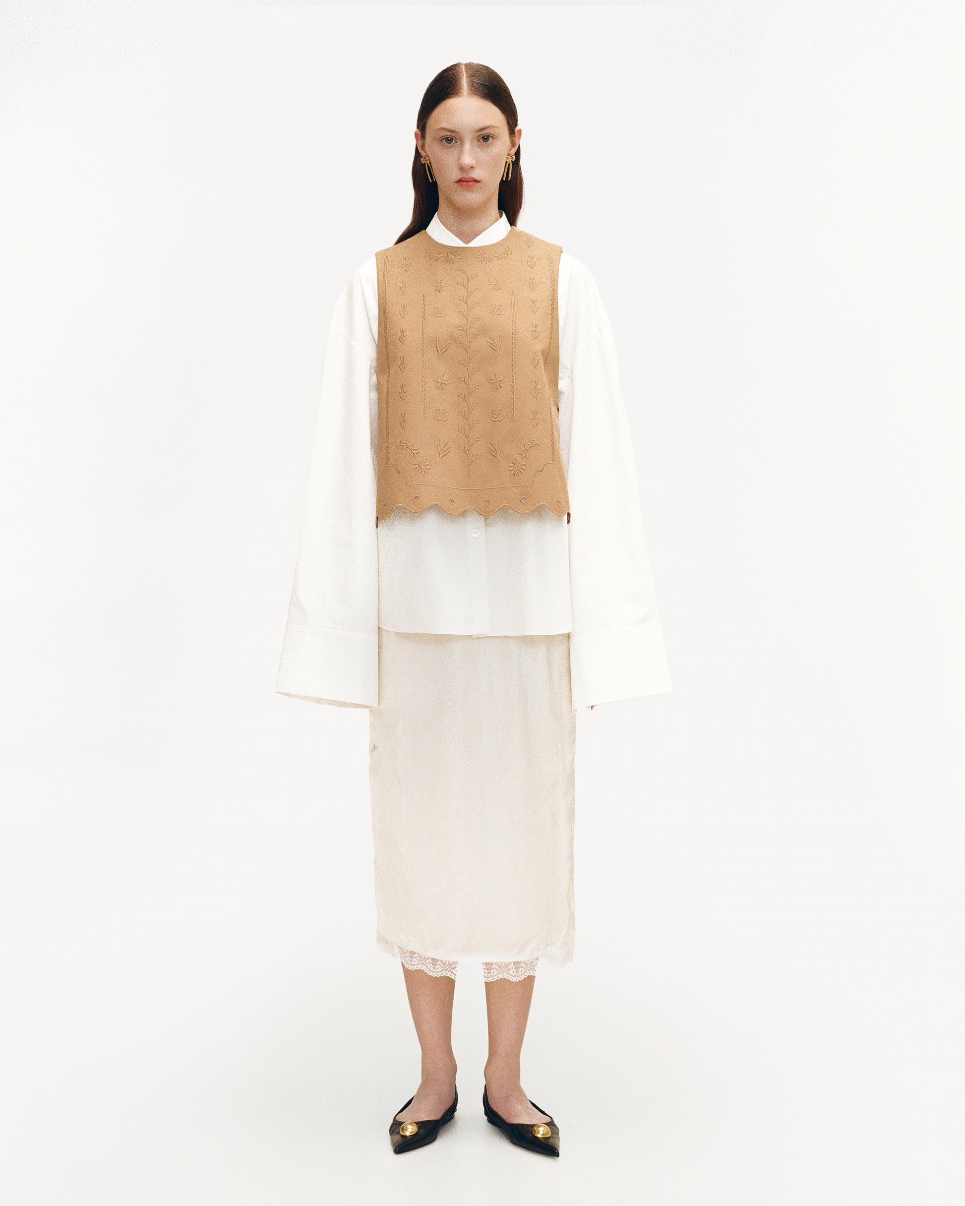 Marta Embroidered Dickey. Straight silhouette, long ties, ornate edge. Inspired by traditional vests, the dickey is adorned with embroidery inspired by wall paintings from the Kamianets region. This garment can be styled for both everyday and festive looks.