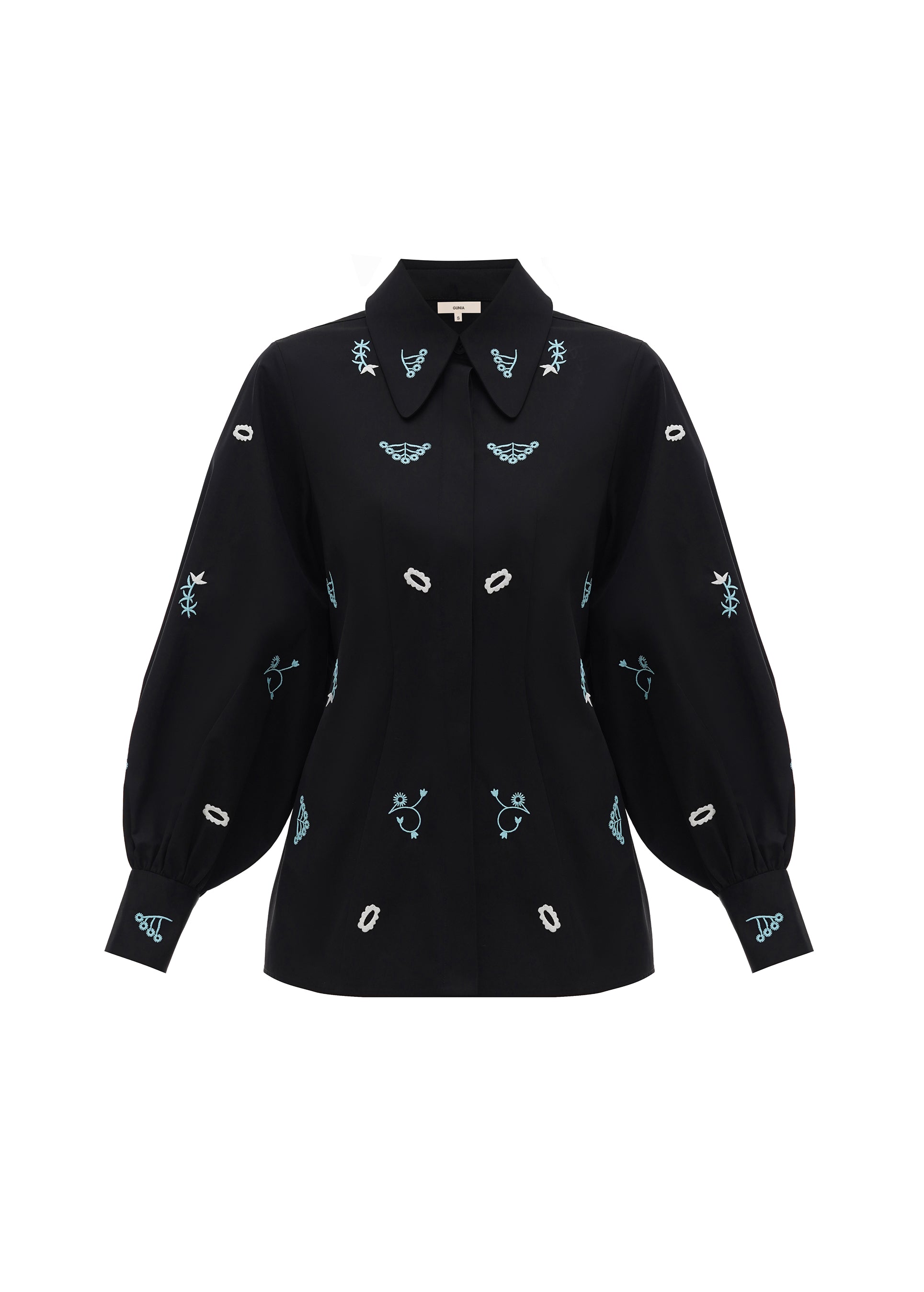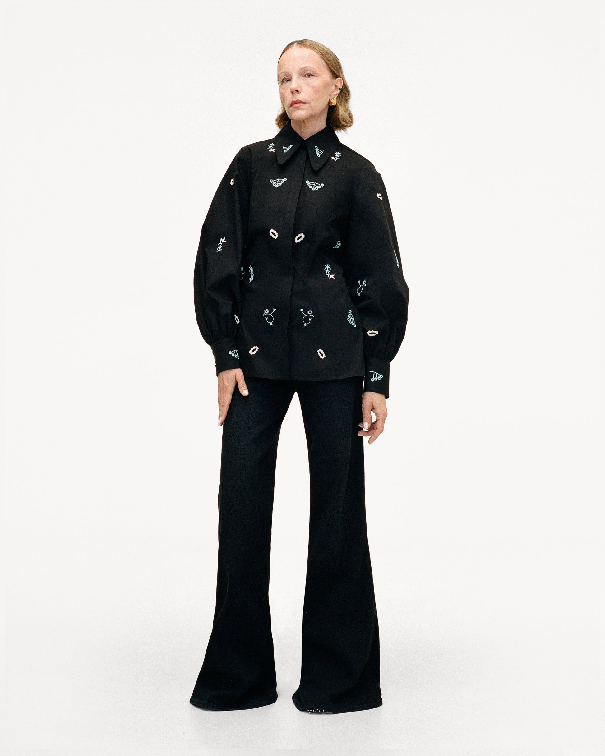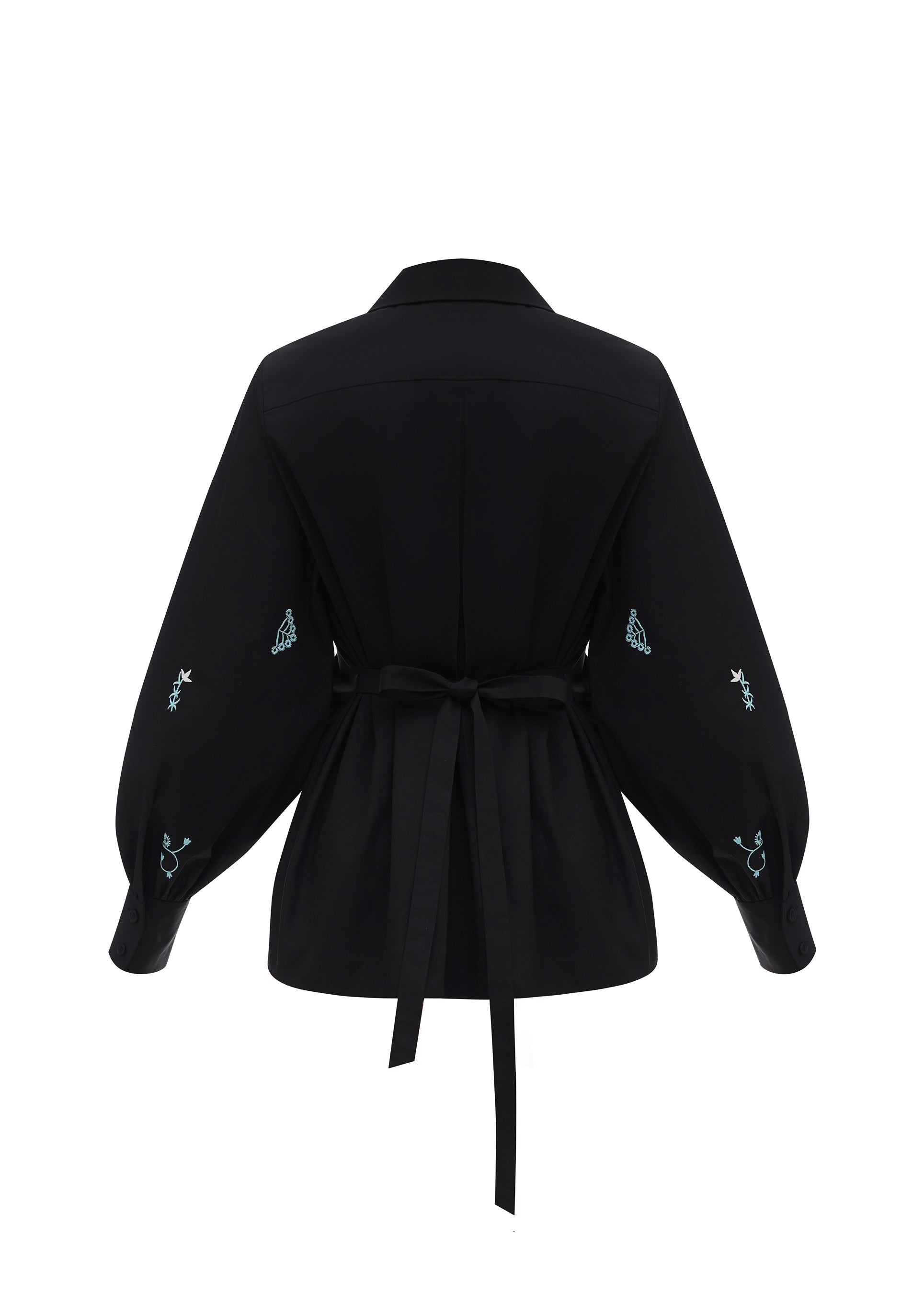 Afiia Embroidered Shirt. Structured silhouette, sewn-in belt, contrasting trim. The shirt is adorned with floral embroidery inspired by home wall paintings and decorative carvings. The sewn-in belt allows you to adjust the style according to your mood, accentuating the waist.
