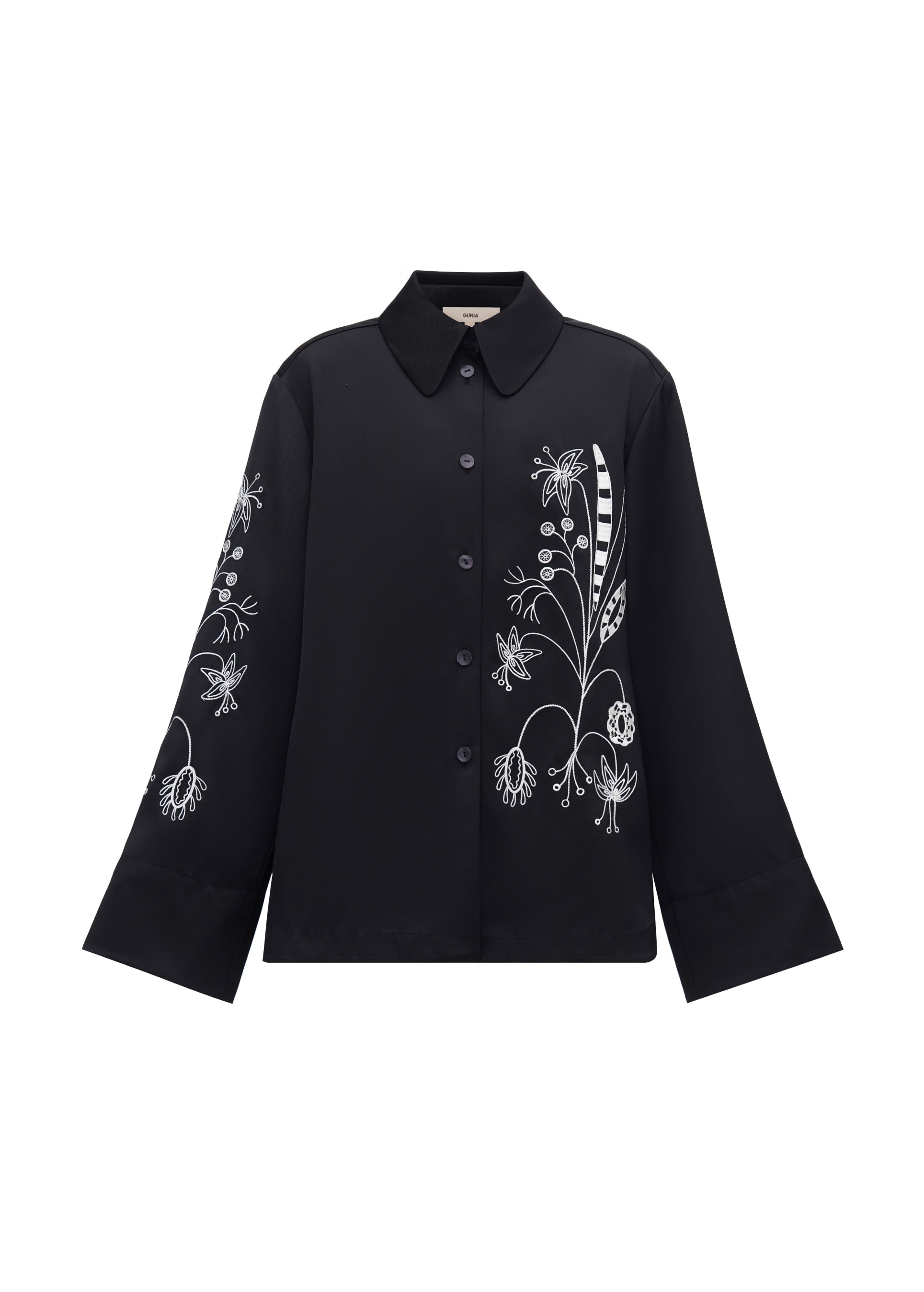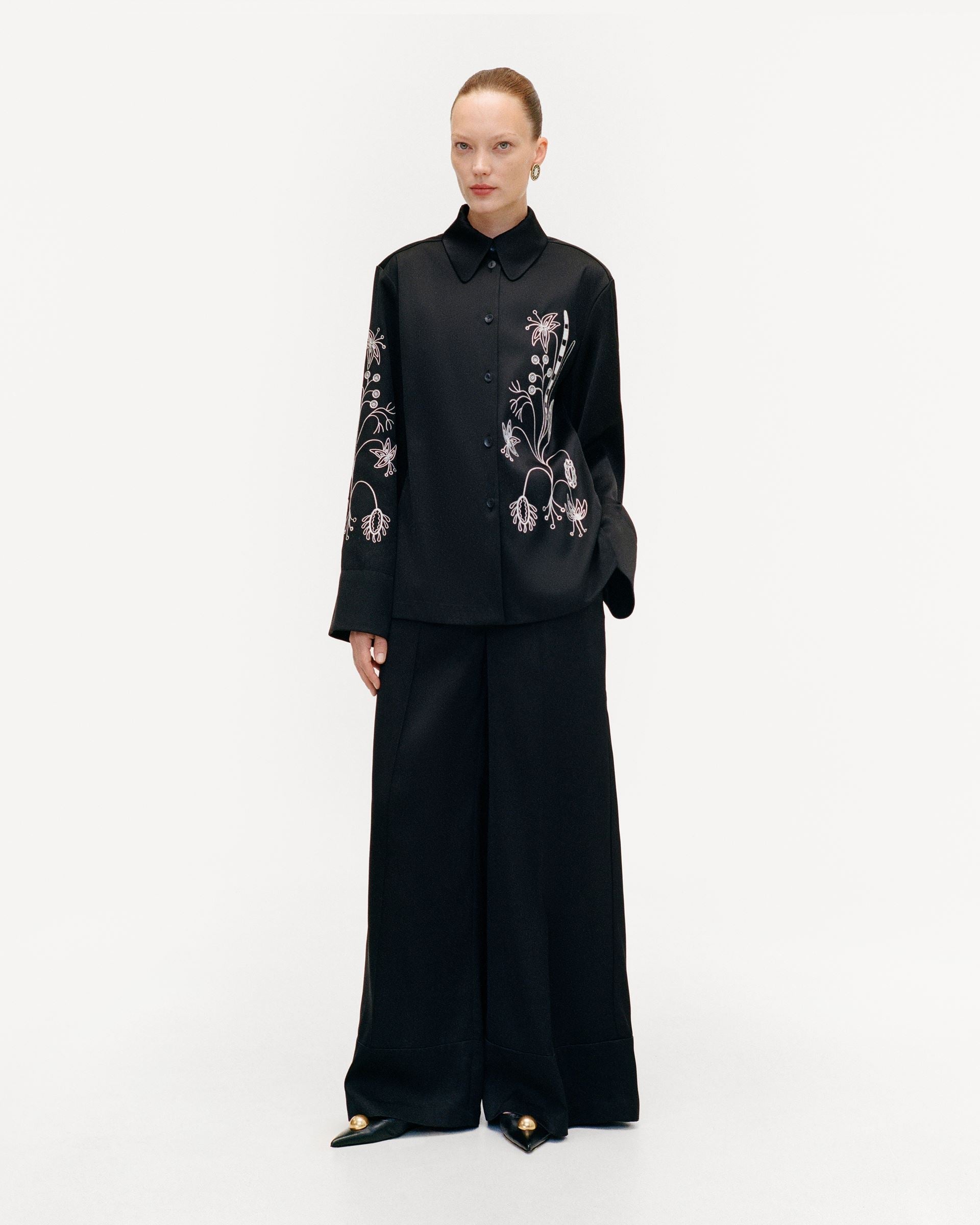 Fedora Embroidered Shirt. Straight silhouette, wide cuffs, contrasting trim. The shirt is adorned with floral embroidery inspired by home wall paintings from the Kamianets region. The garment can be used to style both everyday and festive outfits.