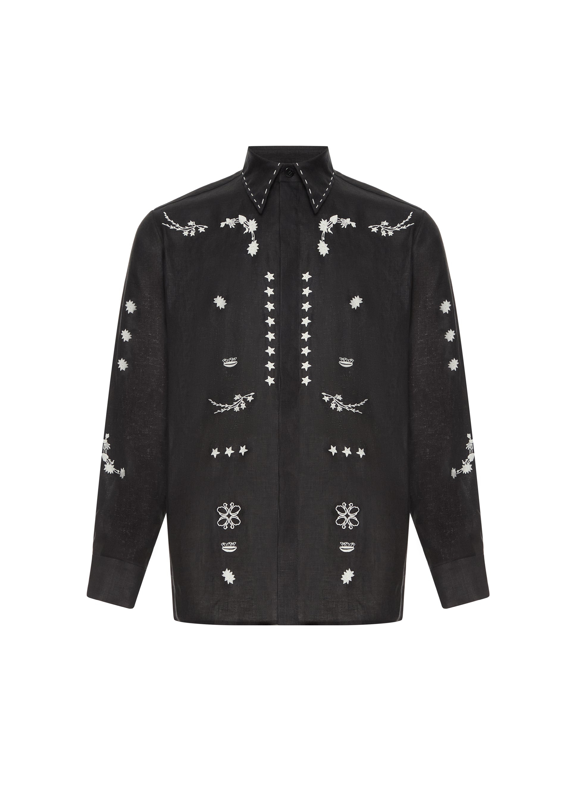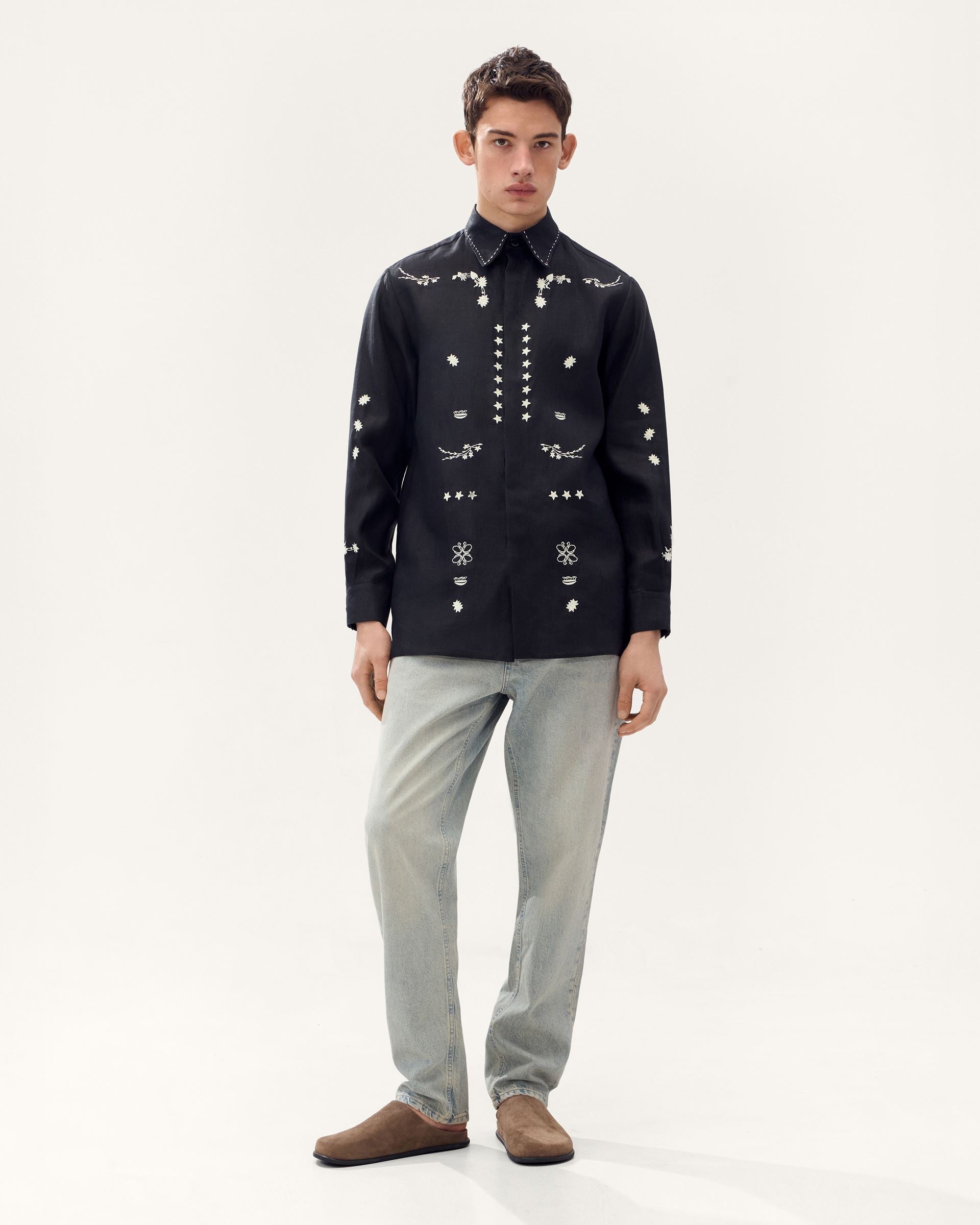 Levon Embroidered Shirt. A modern element of everyday or festive attire that can become a collectible, heirloom garment. Regular fit, hand-finished collar. Crafted from natural linen and high-tech TENCEL™ blend, the shirt is adorned with designer embroidery, inspired by the naïve rushnyky from the 20th century, including pieces from the brand’s private archive, curated to preserve and promote traditional embroidery.