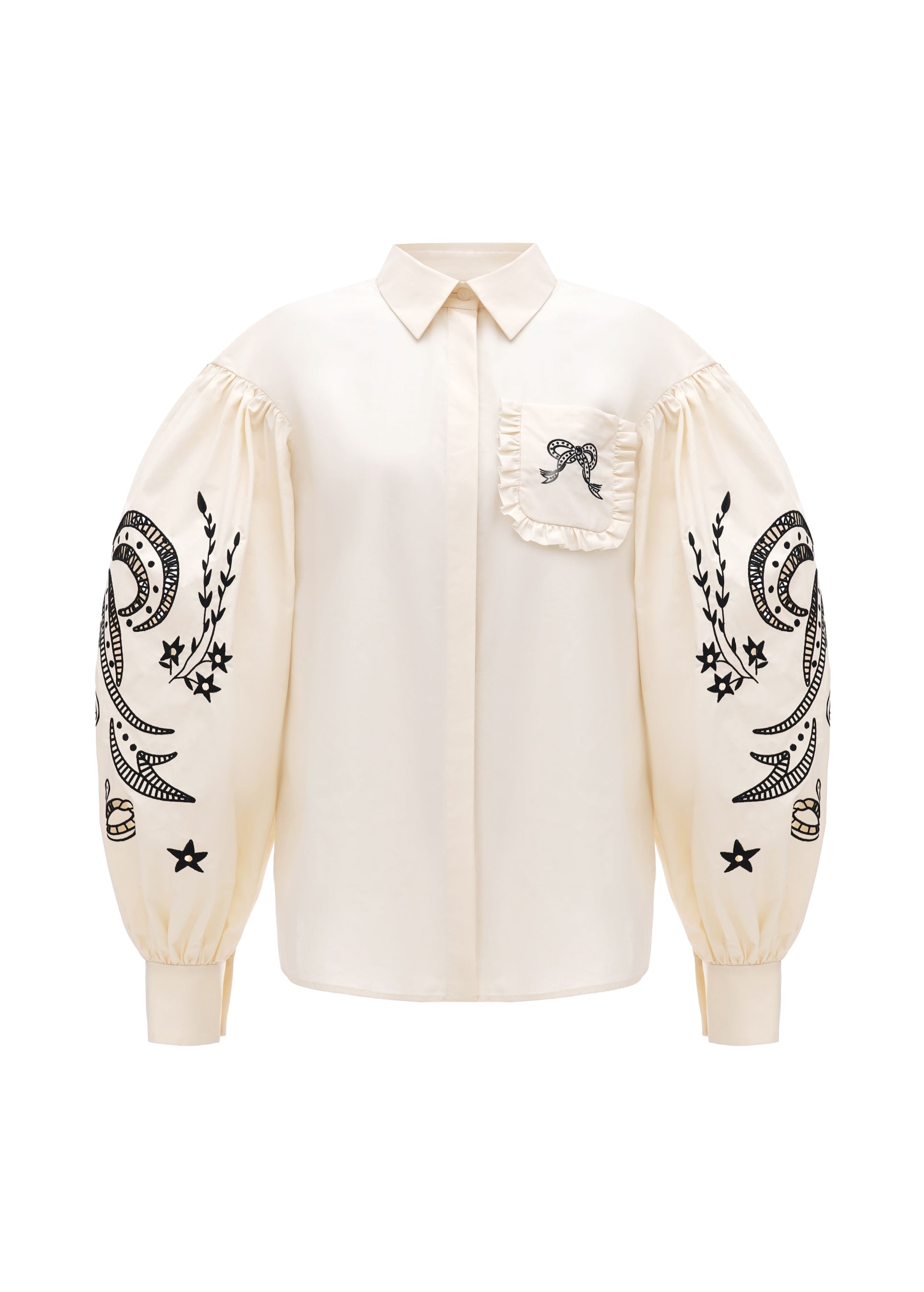 Raiia Embroidered Shirt. A modern element of everyday or festive attire that can become a collectible, heirloom garment. Voluminous sleeves, chest pocket, embellished collar. Crafted from cotton, the shirt is adorned with designer embroidery, inspired by the naïve rushnyky from the 20th century, including pieces from the brand’s private archive, curated to preserve and promote traditional embroidery.