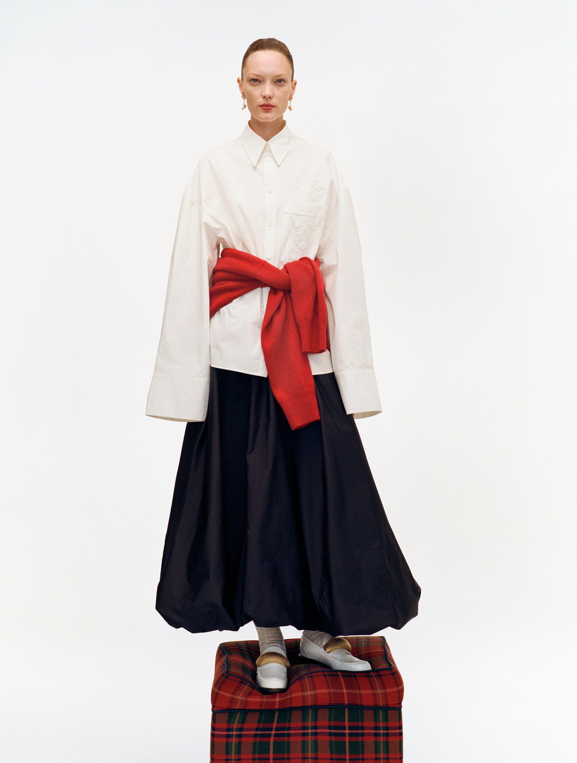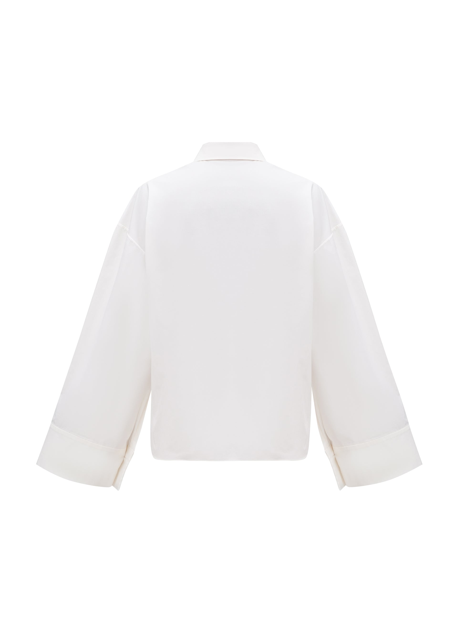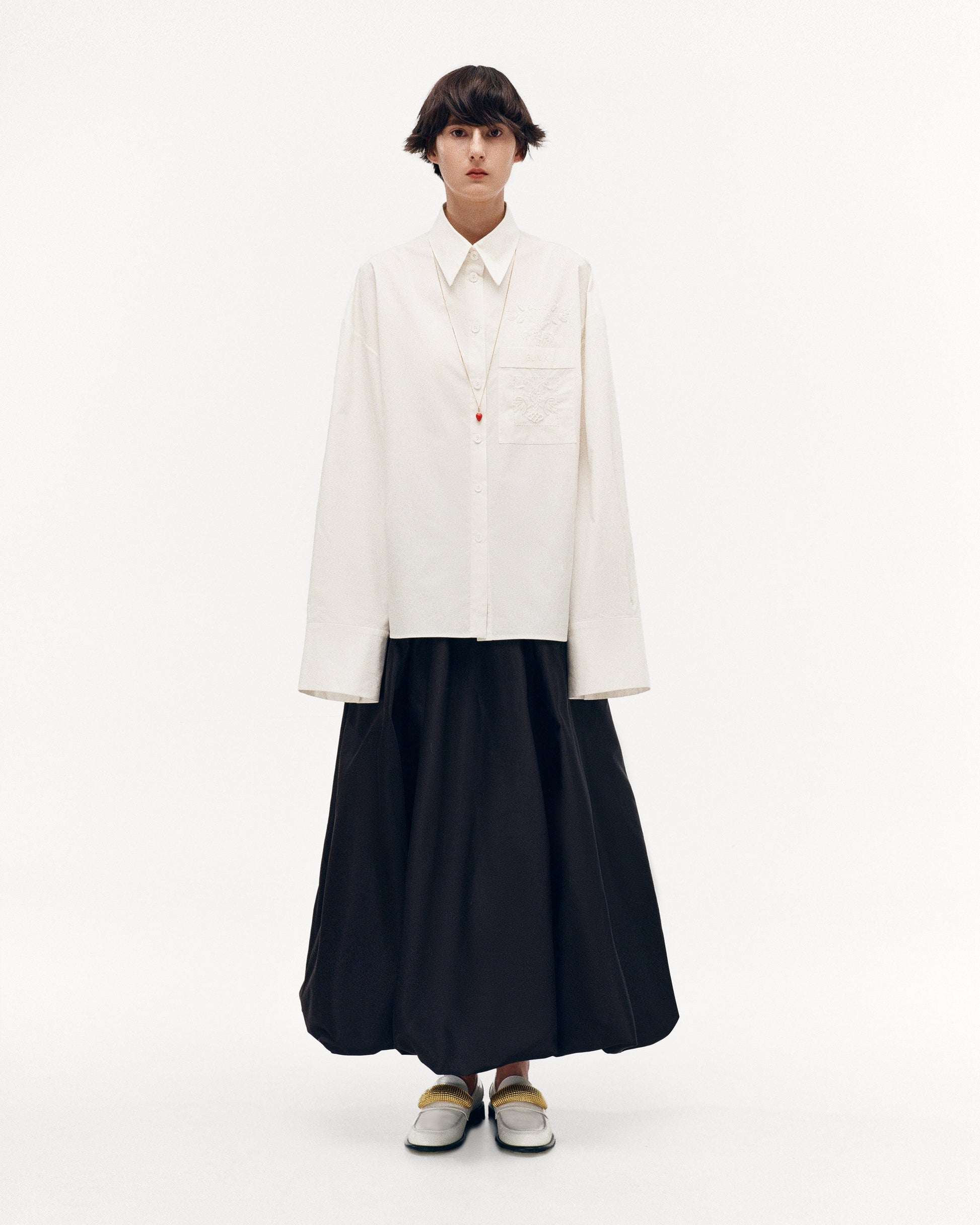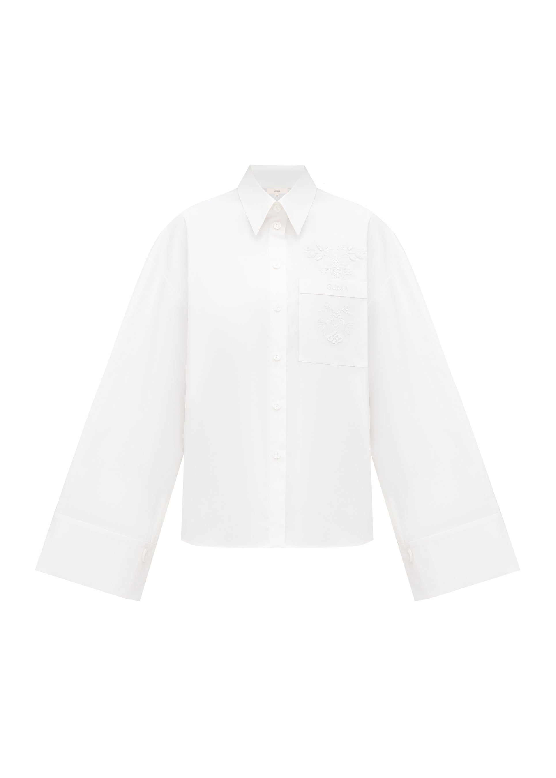 Zoriana Embroidered Shirt. Loose silhouette, wide cuffs, monochrome trim. The shirt is adorned with beaded hand embroidery inspired by wall paintings from the Dnipro region. The garment can be used to style both everyday and festive outfits.